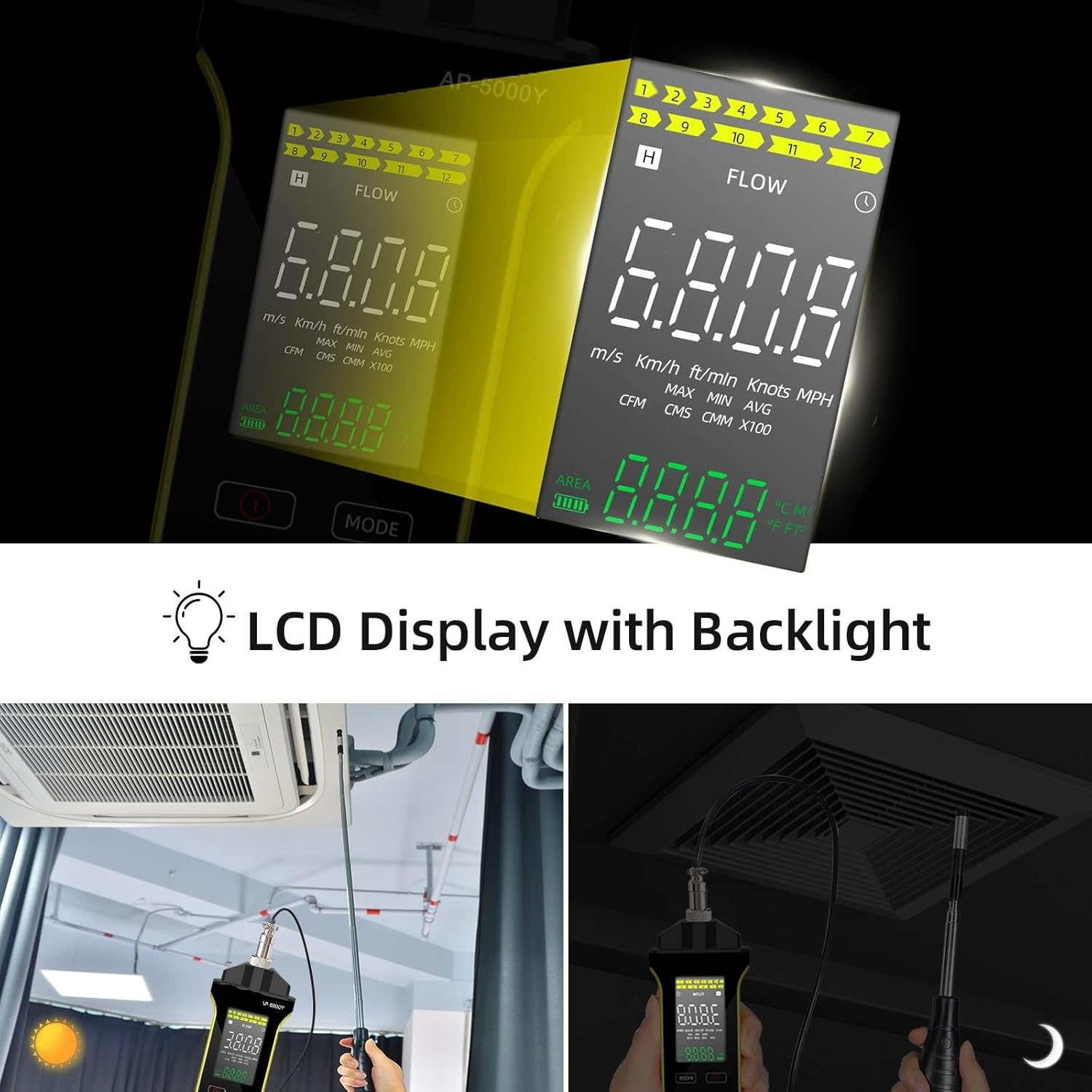 Wind Speed GaugesHandhold 5000Y Thermal Energy Induction Anemometer, Hot-Wire Airflow Sensor Measurement, Low Velocity Air Detection Tester ToolsThis anemometer is equipped with a telescopic sensor, ideal for measurements in confined spaces. Its robust design includes a large, easy-to-read color display that provides clear data visualization. The anti-interference touch buttons ensure seamless operation, even in challenging environments.The 5000Y measures wind speed in multiple units, including meters per second, feet per minute, knots, kilometers per hour, and miles per hour. It also captures airflow rate in CMM and CFM, with the ability to switch between Celsius and Fahrenheit for temperature readings. This versatility makes it suitable for a wide range of professional applications.Designed with the user in mind, the 5000Y includes a low battery indicator to prevent unexpected downtime. The rechargeable lithium battery, charged via a Type-C port, ensures long-lasting performance. An optional auto shut-off feature helps conserve battery life, making it a reliable choice for extended use.Whether you're monitoring environmental conditions, assessing HVAC system performance, or conducting transport evaluations, the 5000Y Hot-wire Anemometer provides the precision and reliability needed for accurate data collection. Its compact, waterproof, and dustproof structure ensures durability, while its advanced features support a wide range of measurement needs.Product Parameter:==========Battery Included : NoHigh-concerned chemical : NoneType : AnemometerModel Number : 5000YWind Speed Range1 : M/s 0.1-30Wind Speed Range2 : Ft/min 19-5905Wind Speed Range3 : Knots 0.2-58Wind Speed Range4 : Km/h 0.4-108