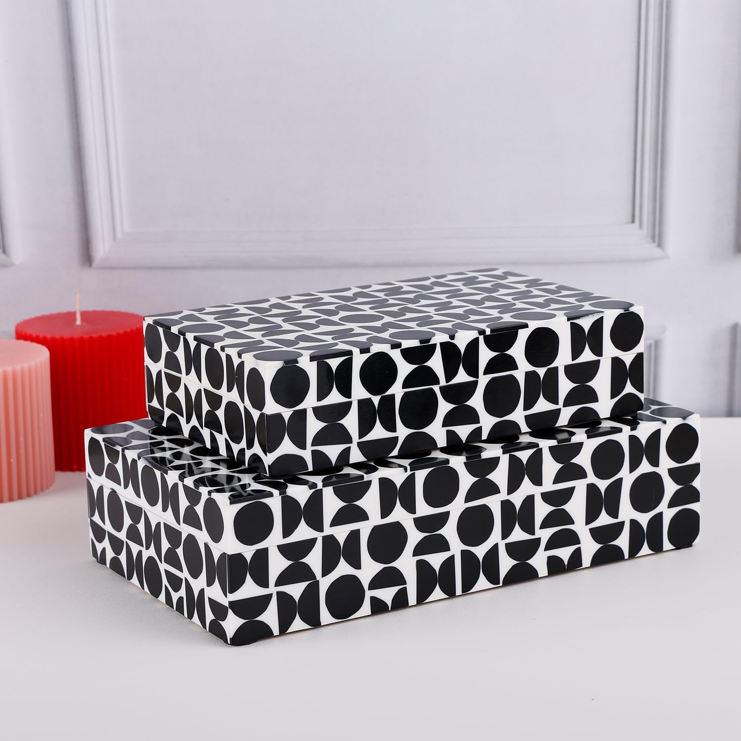 Handicrafts Home Decorative Storage Box - Geopop - Black White Modern Geometric Design – Featuring a sleek, contemporary Geopop pattern with clean lines, this handcrafted box adds elegance and style to your coffee table, bookshelf, entryway, or dresser. Multi-Purpose Organizer – Ideal as a jewelry box, memory box, remote holder, trinket box, or photo storage box, keeping your essentials neatly organized while elevating your home decor. Four Convenient Sizes – Available in Large, Medium, Compact, and Small, each box is designed to suit different needs – from storing keepsakes and letters to everyday accessories and small valuables. Decorative Accent Piece – More than just storage, this decorative box with lid doubles as a stylish decor accent for modern, bohemian, vintage, or minimalist interiors. Perfect for coffee table decor or shelf styling. Authentic Artisan Craftsmanship – Designed in the US and handcrafted by skilled Indian artisans, every piece reflects authentic artistry, cultural heritage, and fair-trade values. Product Details: Color/Pattern: Geopop (Black & White) Material: Resin Inlay & Pine MDF Outer Sizes: 12x8x5, 10x8x4, 9x6x3.5, 8x4x4 inches Inner Size: 9x7x3.5, 9.2x7x3, 8x5x2.5, 7x3.5x3.5 inches Uses: Jewelry Organizer, Keepsake Box, Memory Box, Remote Storage, Coffee Table & Shelf Decor, Mantle Decor, Entryway Decor