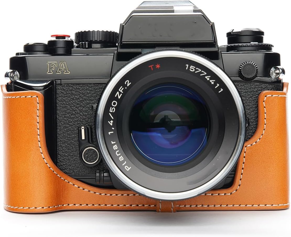 This camera case is all handmade by real top layer cow leather, the design is simple and vintage, use Metal sizing techniques make it very fit with the camera body. Inside lining use high lever velvet to protect camera body for scratch and coloration.Under base screw is made by 304 stainless steel and it can easy take off by hand. You don't need to take off the half case when you use tripod.Content: 1 pc camera half case, not include camera and strap.Material:real cow leather.Color: Coffee.
