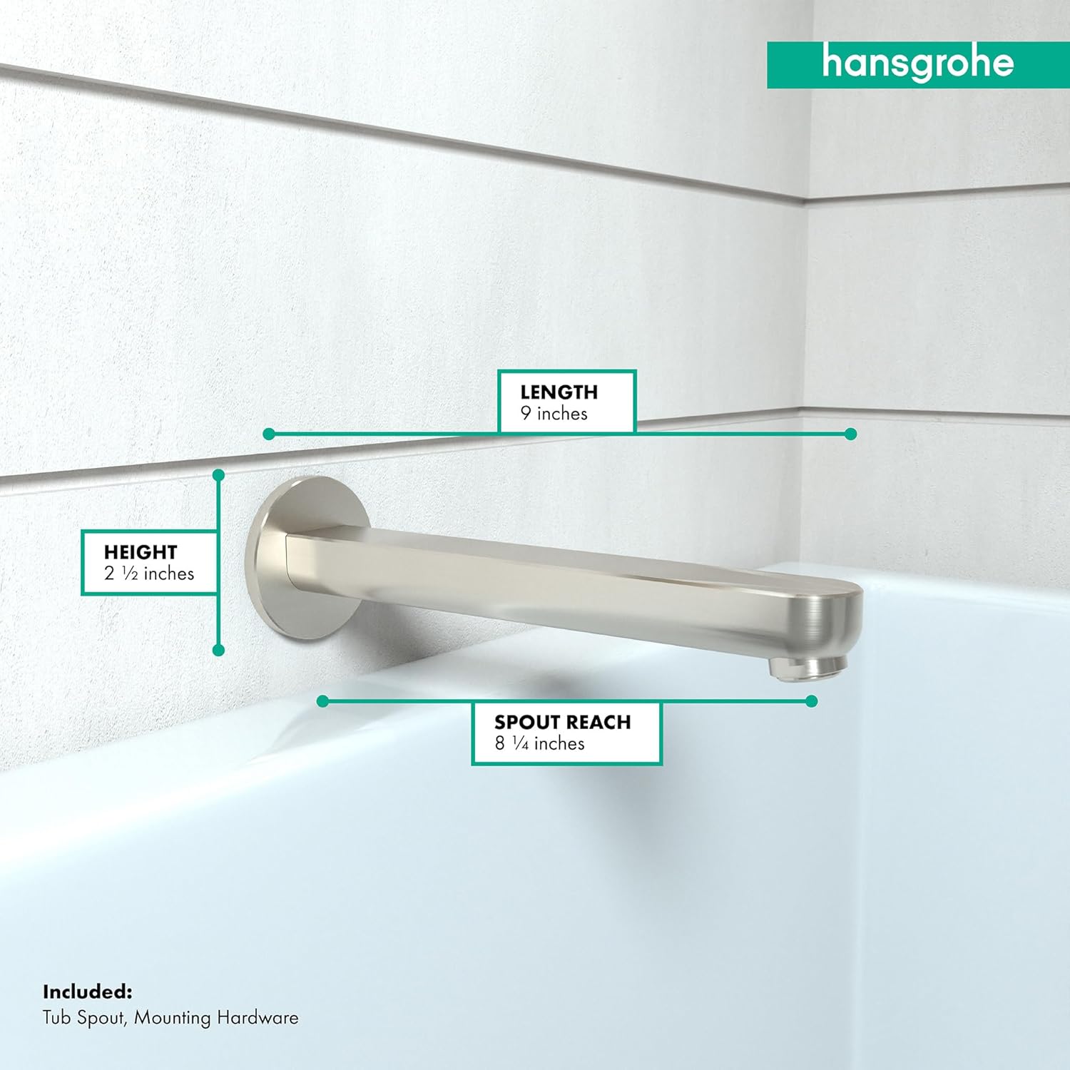 Product Description Visibly enhance your bathroom ambience with Metris fixtures: Metris models have a reduced, modern design and fit in perfectly anywhere. Their generous surfaces ensure luxurious elegance. Their tapered base body and precise contours underline the high quality. You can regulate your desired water quantity and temperature anywhere using the practical single-lever bathroom faucet with an open curve. It's Easy and precise. The Metris faucet line offers various bath faucets for your moments of well-being. The Metris bath collection features a matching tub spout, providing the ability to match shower and bath fixtures to the chosen bathroom faucets. From the Manufacturer S Tub spout Long 9-Inch in Brushed Nickel to coordinate with Hansgrohe contemporary bathroom fixtures. Founded in Germany's Black Forest in 1901, Hansgrohe is committed to building a strong sense of tradition. Hansgrohe's products offer a lifetime of satisfaction featuring the ultimate in quality, design and performance. Customers appreciate our many breakthroughs in comfort and technology that allow you to make the most of water. With its wide range of products, Hansgrohe has the right solution for you. Enjoy every moment, each one is unique, just like your Hansgrohe shower. Hansgrohe has always had a sharp eye for innovation, designing products with exceptional durability that are not only highly functional but also a source of pleasure. For us, this means constantly advancing and striving for improvements. Our showers and faucets offer many useful functions and details that make daily use as easy and comfortable as possible so that you can enjoy your Hansgrohe products for many years to come.