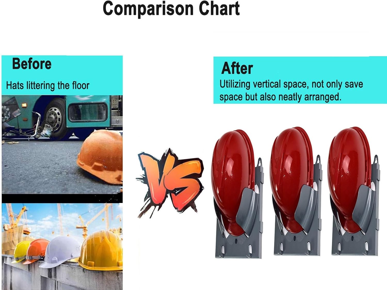 **- **Product Name:** Hard Hat Rack- **Material:** ABS Material- **Size:** 26 x 26.5 cm / 10 x 10.4 in- **Installation:** Wall Mounted- **Color Options:** Blue, Gray, Red, White, Yellow**Package Contents:** - 3 x Safety Helmet Rack (Hard Hat Not Included)**Product Features:**1. Ideal for storing helmets after your work shift.2. The wall-mounted design frees up space and simplifies organization in your office.3. Easy assembly with included installation hardware ensures quick setup.4. The robust design is both stable and visually appealing.5. Open storage design allows for quick and easy access to your helmets.**Additional Information:**1. Please allow for a 1-3 cm discrepancy when measuring by hand.2. Note that slight color variations may occur due to lighting and individual perception; refer to the actual product for accuracy.Keep your workspace tidy and your helmets safely stored with our reliable helmet rack.