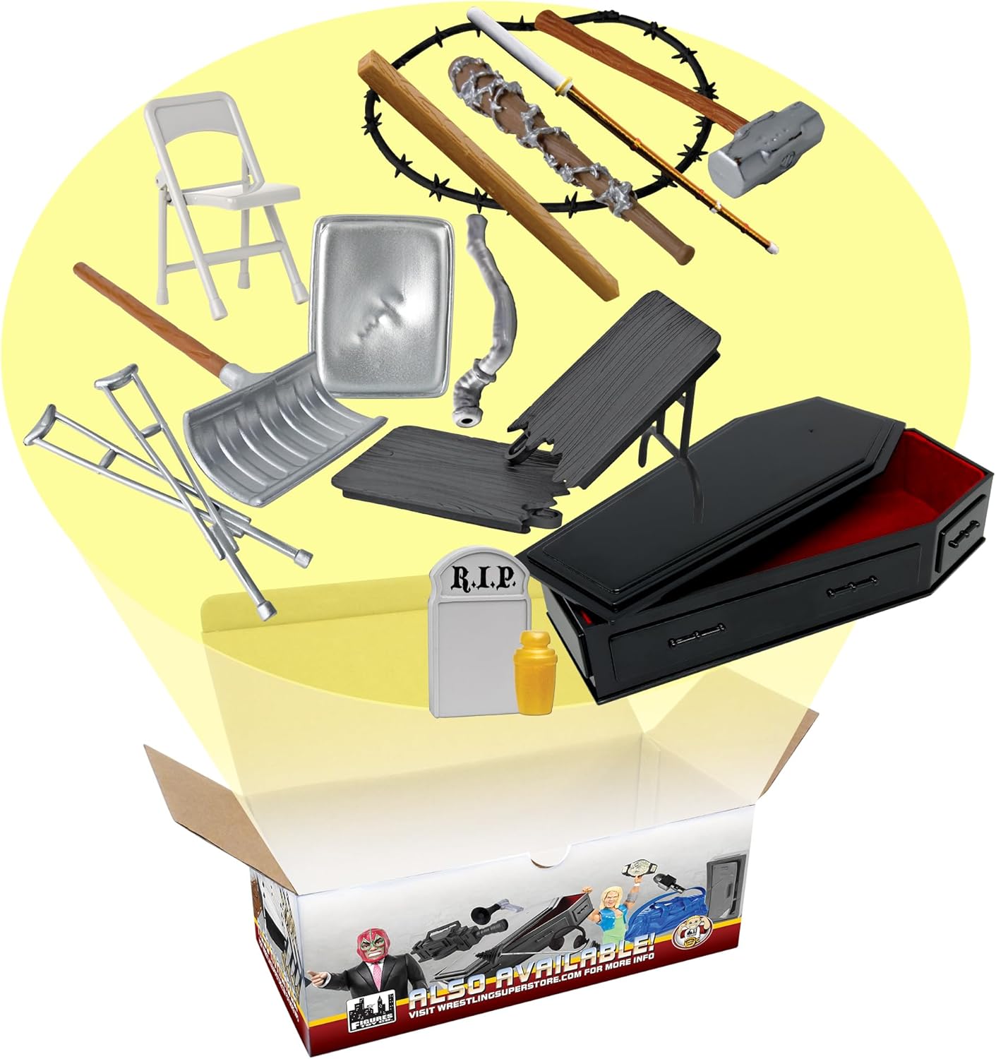 Create the ultimate hardcore wrestling match with the Wrestling Action Figure Hardcore Coffin 15 Piece Accessory Set. This set includes a realistic coffin, a breakable table for dramatic moments, a tombstone, and an urn for your buried alive matches. Enhance the intensity with a 2x4 stick, a pair of crutches, and a snow shovel for those extreme confrontations. The set also features a pipe, a tray, a folding chair, barbed wire, a barbed wire bat, a kendo stick, and a sledgehammer, providing everything you need to recreate brutal, high-stakes matches. Perfect for any wrestling fan looking to take their action figure collection to the next level. Compatible with all wrestling action figures. Also a good scale for other 6-8 inch action figures.