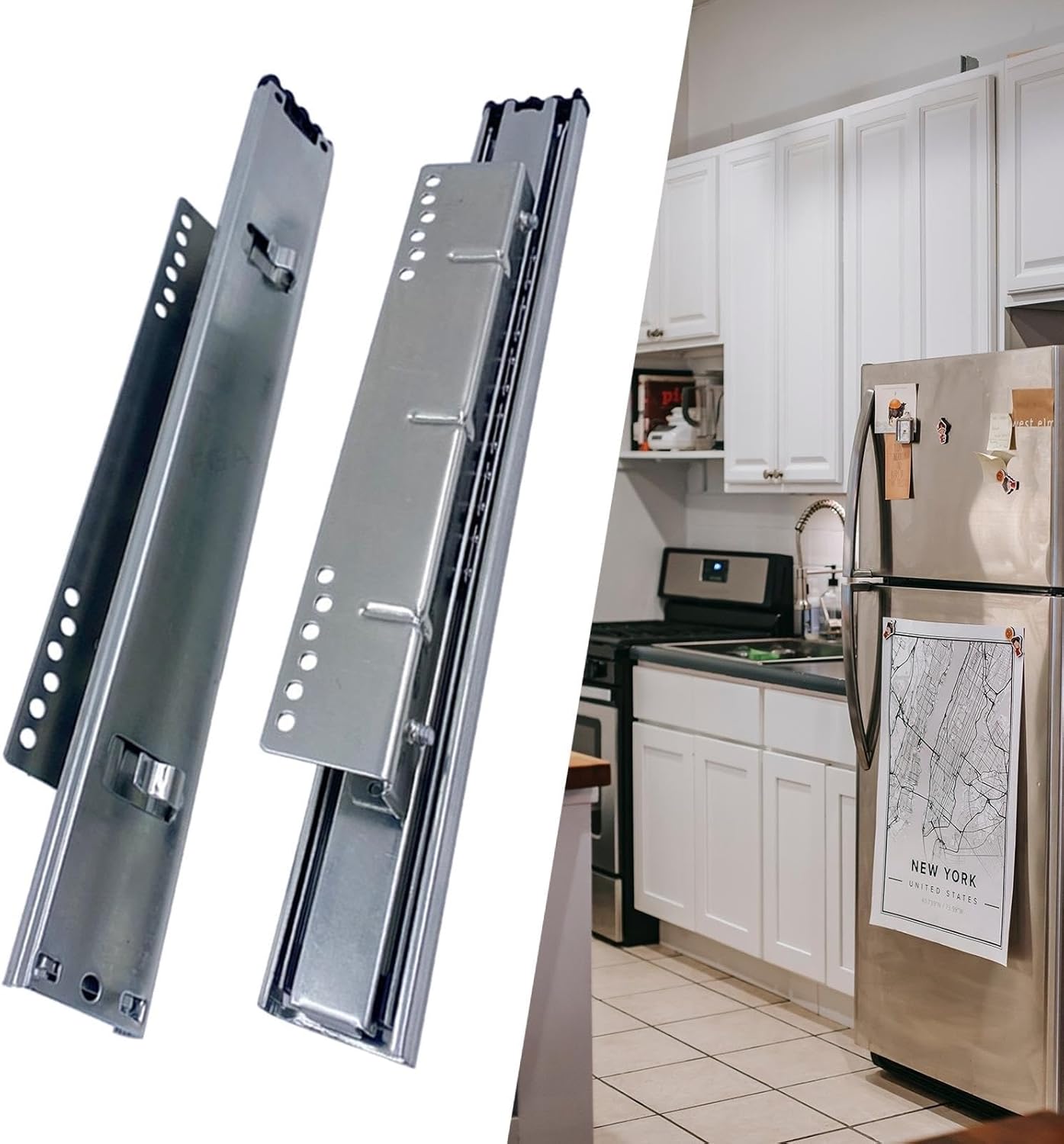 1. Excellent wear and impact resistance, capable of withstanding heavy storage loads without deformation.2. Drawers extend fully for convenient storage.3. The slides can be used in cabinets, industrial drawers, vending machines, and more.Description:Cabinet hardware: The storage basket slider can easily turn the storage basket into a drawer, easy to pull and push, and fully extended length :80cm/31.50 inches.Smooth: Steel ball bearings open and close smoothly, greater stability, fully expand the slider, easy to store items.Easy to install: The drawer slide can be easily fixed in your desired position and easy to install.Material: Basket slider made of thickened steel plate, can bear 45kg weight, impact resistance, good bearing capacity, strong and durable.Widely used: suitable for kitchen, office, bedroom, cabinets, shelves, baskets, trash cans and so on.Specifications:Material: SteelSize table:Maximum extension length :80 cm /31.50 inchesTotal length :40cmx4.5cm /15.75inchx1.77inchThe package includes:1 pair of drawer slides