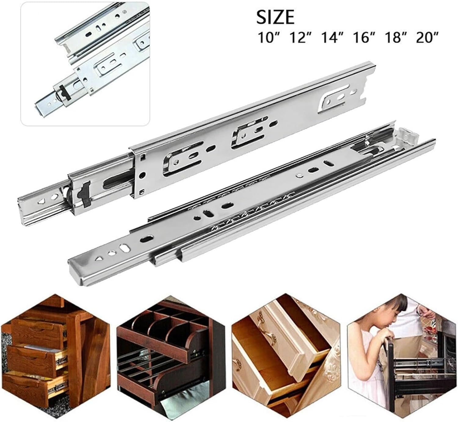 1. Excellent wear and impact resistance, capable of withstanding heavy storage loads without deformation.2. Drawers extend fully for convenient storage.3. The slides can be used in cabinets, industrial drawers, vending machines, and more.Features:*Made of high quality cold-rolled steel that is electrom zinc plated.*Steel ball-bearing that is remarkably smooth and quiet.*These slides fits most drawers, perfect for new construction, remodeling, and replacement projects.*Lever disconnect for easy drawer removal.Specifications:*Material: Harden cold rolled steel*Length: 10", 12", 14", 16", 18", 20"*Load Capacity:100 LB*Extension: 3 Folds full extension bearing*Mounting Type: Side-mountedPackage Includes:1 Pair Drawer Slides