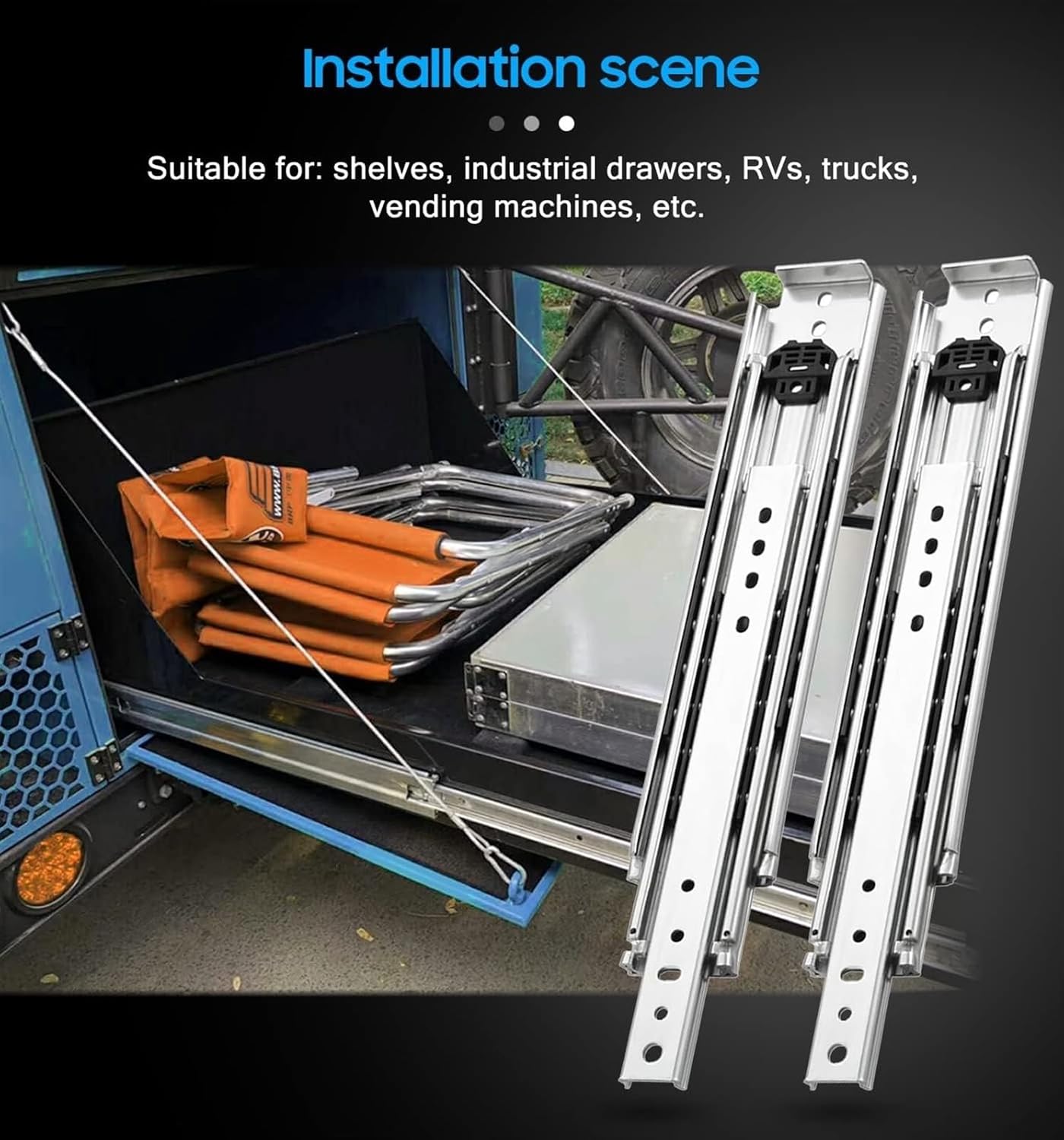 1. Excellent wear and impact resistance, capable of withstanding heavy storage loads without deformation.2. Drawers extend fully for convenient storage.3. The slides can be used in cabinets, industrial drawers, vending machines, and more.Size: 8-68inchHeavy drawer slide with lockSurface treatment: sealed blueWidth :76 mmThickness :25 mmFull extension of three stages by opening methodMaximum load :220 kgMaterial: cold rolled steel