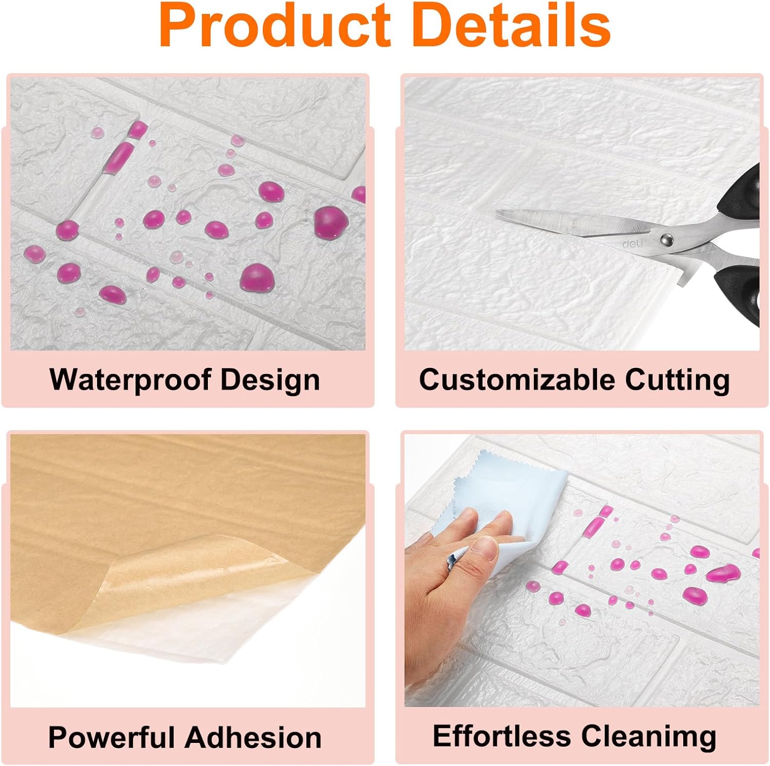 1. Made from a durable XPE composite, this 3D wall panel is not only waterproof and moisture-resistant but also exceptionally durable. Good for kitchens and bathrooms, it retains its aesthetic appeal over time, providing a long-lasting and stylish decor solution.2. The wall stickers feature a 3D effect with a textured, raised masonry design that greatly enhances both visual and tactile experiences, making your space more modern and minimalist. Minimal maintenance, effortlessly maintain a fresh appearance, simply wipe clean the peel and stick 3D wall panels with a damp cloth to keep these tiles looking great, making them practical for busy households.3. 3D wall panels peel and stick are multi-functional and can be easily applied to enhance the aesthetic of various surfaces in kitchens, bathrooms, and living areas, offering a quick and stylish upgrade without the need for extensive renovation.4. These peel and stick shower wall backsplash tiles feature a self-adhesive backing for easy, hassle-free installation. Just peel off the backing and stick the tiles to any clean, dry surface—no grout or special tools required. Great for quick and effortless updates to your space.5. Please note that rough surfaces are not suitable for installation, such as brick walls, stone walls, plaster walls, stucco walls, plywood walls, orange peel walls, or oily walls.