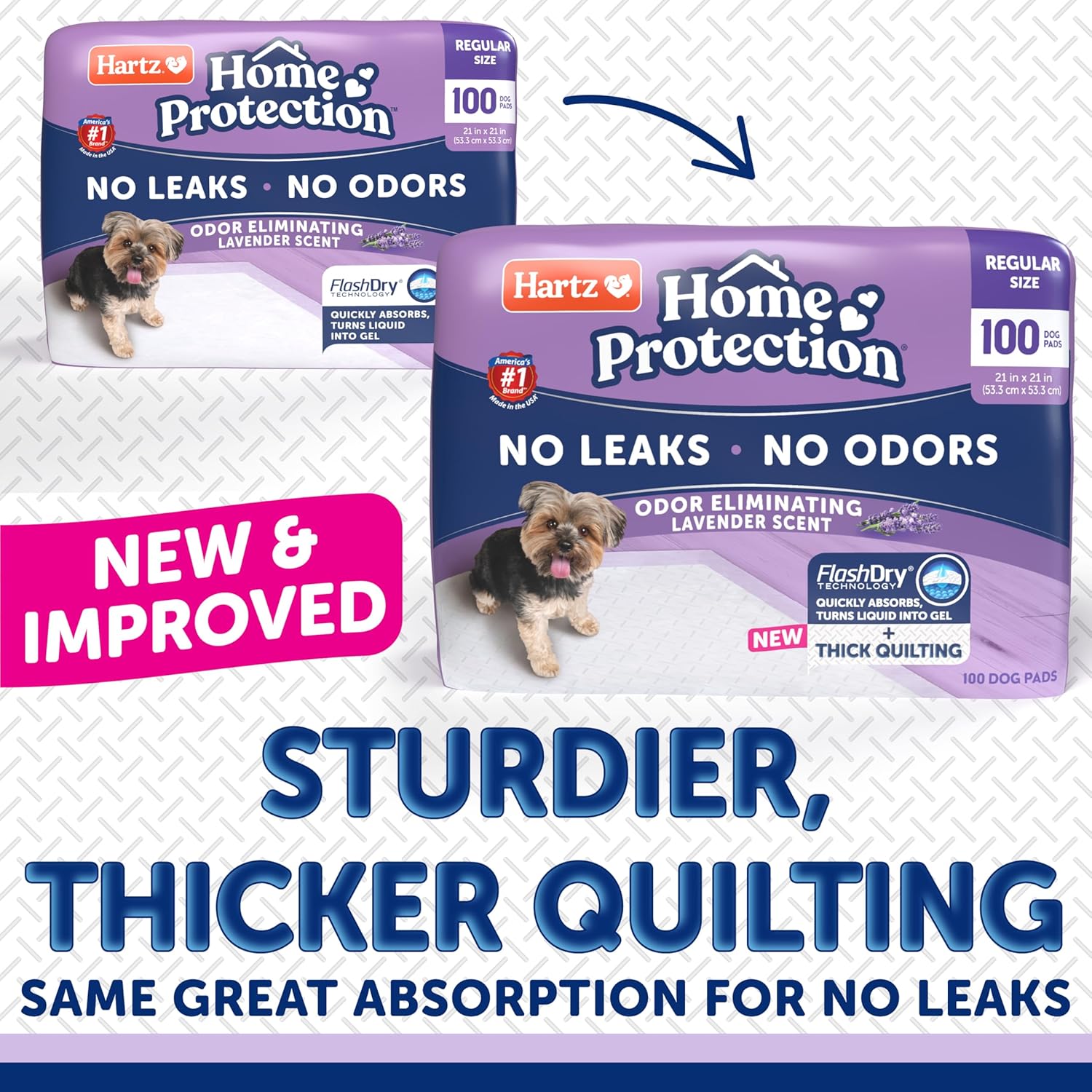 Coming home to pet messes is not how anyone likes to unwind after a long day, which is why we set out to create the ultimate dog pad. The Hartz Home Protection line of training pads make clean-up simpler, pad replacement and disposal easy, plus safeguard flooring from unpleasant accidents. Excellent for dogs living in homes with limited access to the outdoors, senior pups with restricted movement, puppies in training or sick dogs, Home Protection has you covered at every corner. Our absorption experts analyzed urine distribution and designed a pad with 6 layers, containing our patented Flash-Dry technology which creates a smaller urine spot and allows for multiple uses per pad. When nature calls, Home Protection instantly turns urine into gel to reduce tracking and make clean up a breeze. A water-proof plastic backing and borders ensure our pads won’t leak or spread. The special odor eliminating capability within all our lavender scented pads traps and neutralizes stinky smells left behind, turning eww to phew.