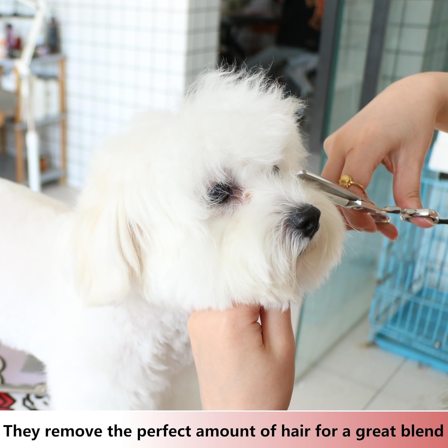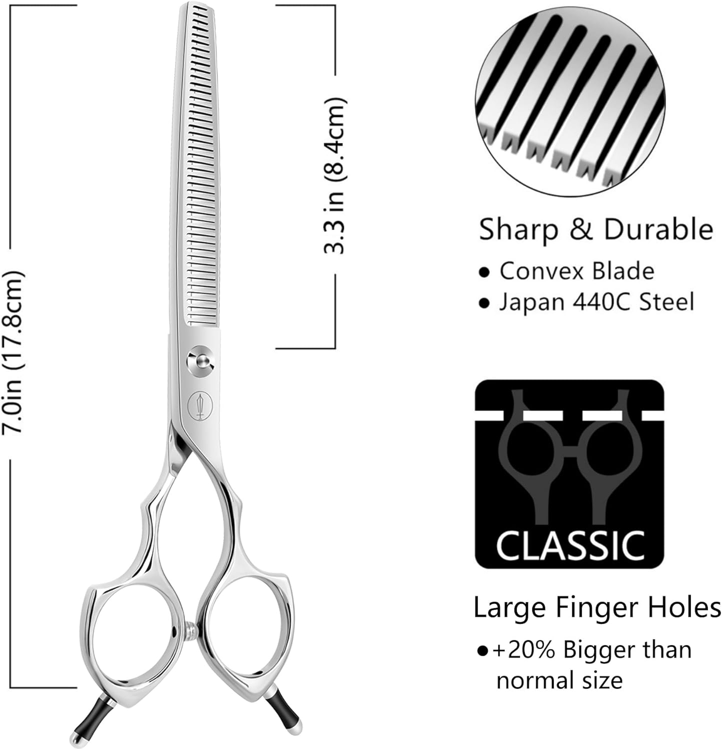 【Large Finger Holes】-- Special designed for large hands,it comes with comfortable black silicone finger inserts. 【30% Thinning Rate】– These scissors have super sharp teeth in V shapes. 45 teeth on one side give 25-35% thinning rate. They can evenly trim with ease and it's good for getting the thickness out without cutting length. You’ll achieve flawless results every time without any damage.【Sharpness】-- Blade making of 440C Stainless Steel; Make sure the sharpness and smooth. 【Light Weight】-- Slim body designed for dog groomers, the light weight makes your hands feel more comfortable during the grooming. 【Affordable】-- If you do not want to spend a ton of money, these scissors is your choice. As a back up pair for professional groomers and a must have for a pet owner groomer.