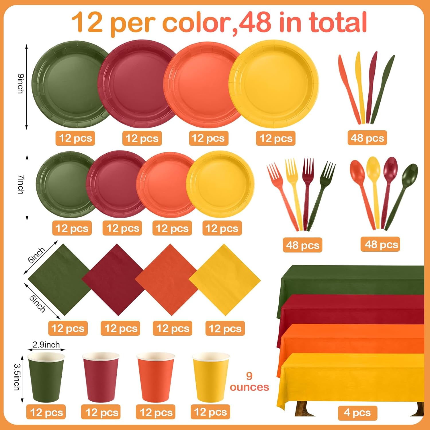 Features: Disposable party supplies are designed to lighten the workload after the party. Don't worry about piles of plates, you can simply roll them up and throw them away. This not only saves time and energy, but also alleviates concerns about environmental pollution. Now, you have enough time to enjoy a relaxing party with your loved ones without worrying about the upcoming cleaning work. Our solid color tableware set is not only suitable for Thanksgiving and autumn, but also for other terms. The versatile solid color style can make you have a good experience at any party. Specifications: Material: paper, PVC, plasticColor: orange, yellow, burgundy, and dark greenSize: Large Paper cups: 9 inches/ 22.86 cmSmall Paper cups: 7 inches/ 17.78 cmThanksgiving napkin: 10 x 10 inches/ 25.4 x 25.4 cmPaper cup: 9 oz/ 266.13 ml Package includes: 48 x Paper cups96 x Paper plates48 x Square paper towels48 x Plastic knives48 x Plastic forks48 x Plastic spoon4 x TableclothsNotes: Manual measurement, please allow slight errors on size. The color may exist a slight difference due to different screen displays.
