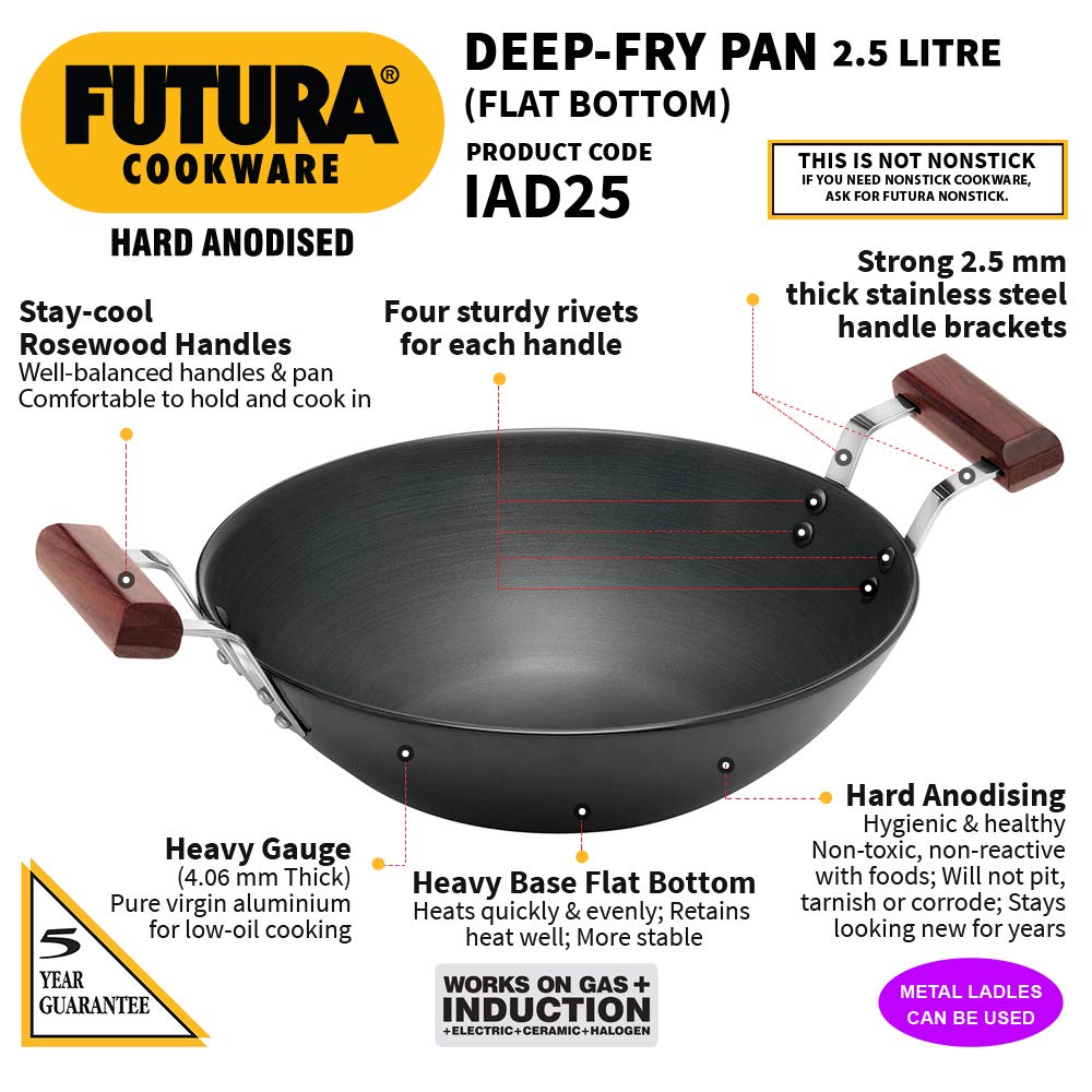 The Futura Hard Anodised Deep-Fry Pans are distinguished by elegant, comfortable rosewood handles fixed on sturdy stainless steel brackets which are permanently riveted to the pans. The handles are carefully designed to provide greater comfort and safety, particularly when handling heavy loads or hot oil. The pans have curved sides suitable for deep-frying and stir-frying. The Hard Anodised finish on these pans will stay looking new for years. The pans are offered with a Flat Bottom for greater stability on gas and for use on cooktops with a flat surface such as induction, electric, ceramic and halogen. Read more