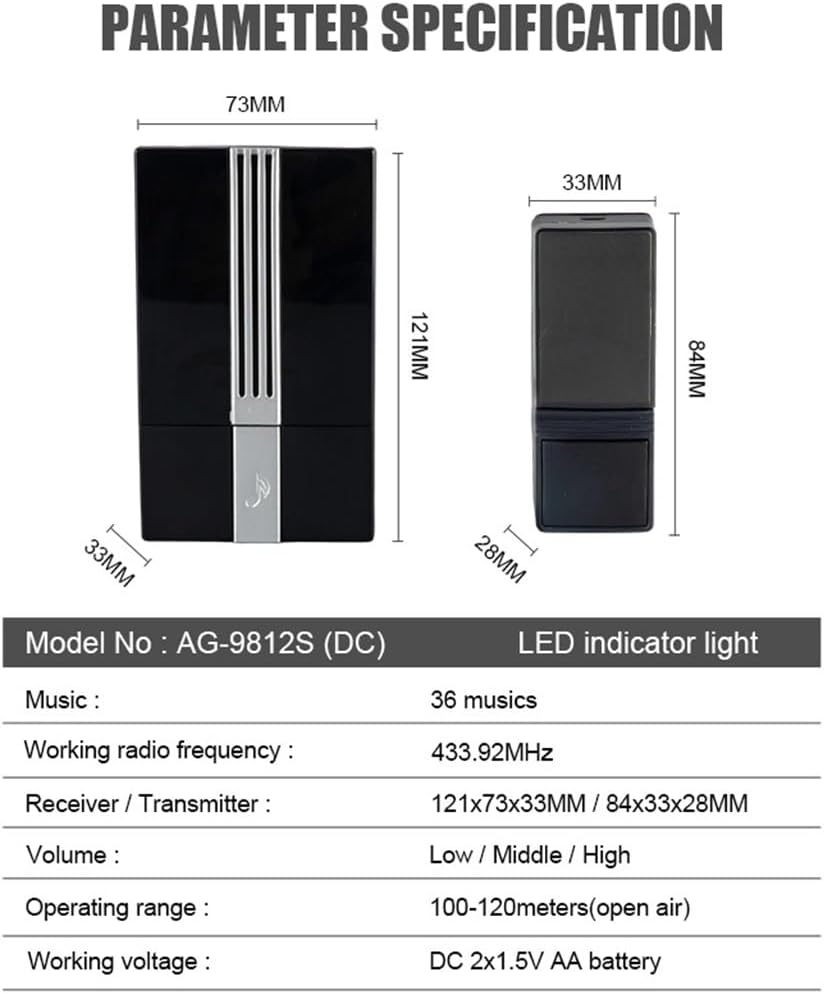 Press the button, super learning code can freely learn to match, can be unlimited matching receiver.The receiver is a distance of 300 meters (in an opening area), which may be affected by the environment and obstacles.Automatically save the selected ringtone after power off.Flexible design, convenient installation, no wires, save money and labor, and move freely.Built-in stereo speaker, especially suitable for office buildings, houses, factories, tourism and other places.Power supply mode: ACPower supply voltage: 220V (V)Ringing tone: 36Power consumption: 0.2 (W)Scope of application: householdType: doorbellSize: as shownPacking listDoorbell*1Visual intercom, remote video call.