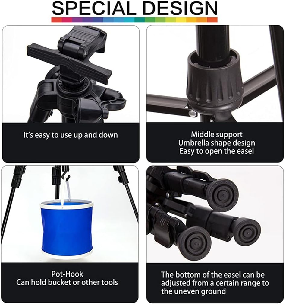 This black easal is lightweight, adjustable, portable, sturdy. Popular by Outdoors sketching - Painting at home - showing shelf - Pictures displaying stand - AD frame - Wedding Photos display - Home improvement - Drawing practice and more.Max height of drawing board: 31.4 Color: BlackSuitbale for:Kids, Art students, Amateur artists, Professional artists。Specifications:Materials: Aluminum Alloy and Plastic accessory and Zinc-plated screw caps (smooth surface and pollution-free, safety for you. Not to hurt the hand) Weight: 3.1 lbs / 850g Load-bearing:15 pounds Extended height: 61 / 155cmFolded size: 25.5 x 4.3 x 3.7 / 64.8 x 10.92 x 9.4 cmPackage Includes:1 x Aluminum alloy easel, 1 x Thicken bag,1 x fixing barInstallation Instructions: Step 1:Adjust the leg height—Undo the 2 clips on each leg of the tripod, then extend the tripod legs to the length you need and fix the clips. Step 2:Adjust the bracket—Turn the crank, then adjust the bracket height according to the board or canvas size. Please loose the securing clip before turn the crank. Step3:Adjust the spring clip to fix the board—Put the board between the painting holder and the spring clip, adjust the spring to fix the board according to the board thickness.It can be used as a desk/table Easel, display stand for painting work and advertisement.