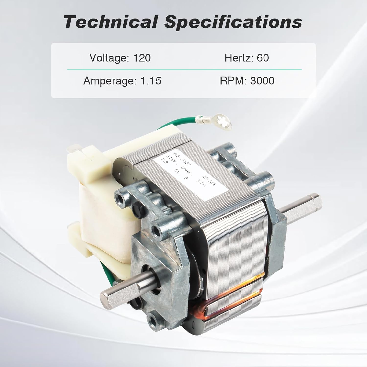 • Technical Specifications:Voltage: 120, Hertz: 60, Amperage: 1.15, RPM: 3000, Insulation Class: B, Bearings: Ball. Cooling Wheel Shaft Type: Single Side Flat Shaft, Cooling Wheel Shaft Length: 1 1/4", Cooling Wheel Shaft Diameter: 1/4". Blower Wheel Shaft Type: Single Side Flat Shaft, Blower Wheel Shaft Length: 3/4", Blower Wheel Shaft Diameter: 1/4".