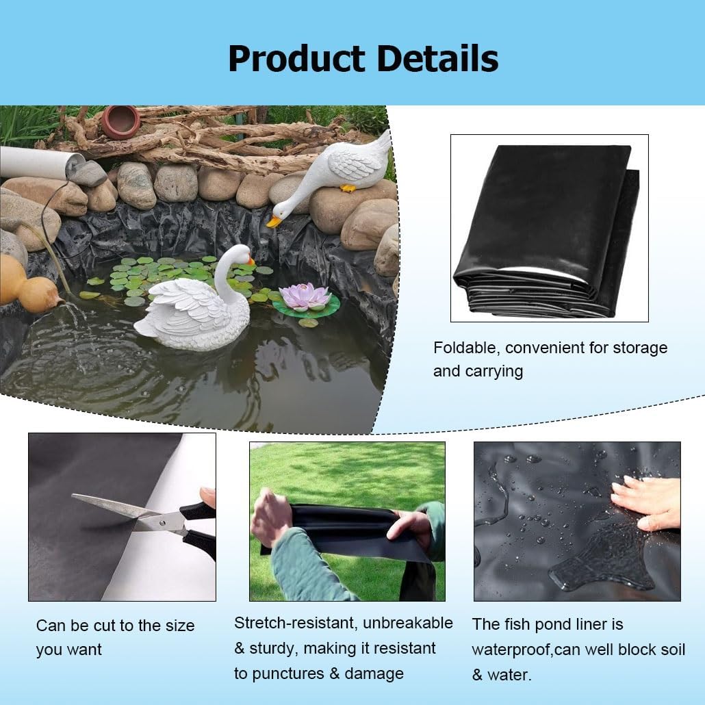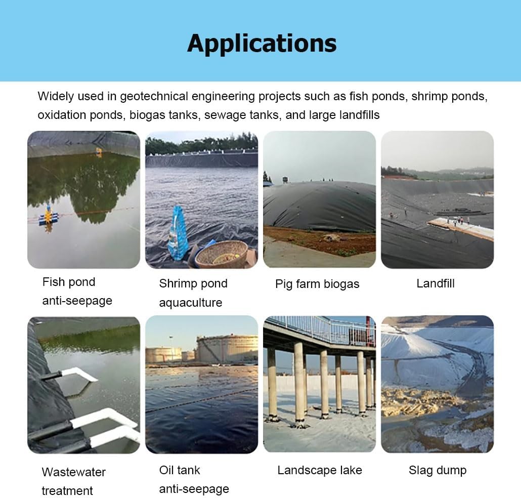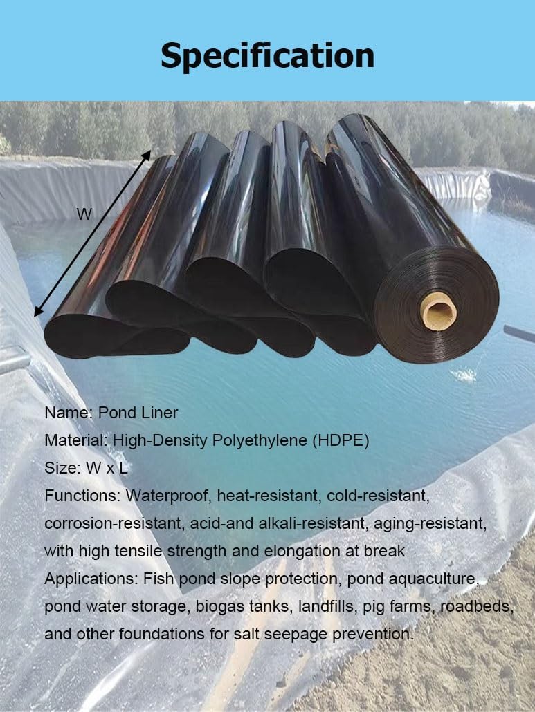 Are you still looking for a pond liner?Our professional, waterproof pond liners are weather-resistant and can be cut to any size you need. They are widely used in ponds, fish ponds, duck ponds, shrimp ponds, sewage treatment plants, landscape lakes, pig farm biogas plants, landfills, and moreName: Pond LinerMaterial: High-Density Polyethylene (HDPE)Size: W x LFunctions: Waterproof, heat-resistant, cold-resistant, corrosion-resistant, acid-and alkali-resistant, aging-resistant, with high tensile strength and elongation at breakApplications: Fish pond slope protection, pond aquaculture, pond water storage, biogas tanks, landfills, pig farms, roadbeds, and other foundations for salt seepage preventionFeatures:1. Strong stretch resistance2. Weather resistance, high and low temperature resistance3. Cuttable, can be cut to any size required4. Waterproof5. Suitable for crab, lobster, leech farming, bathing ponds, fish ponds, reservoirs, sewage tanks, fertilizer ponds, fish pond slope protection, lotus ponds, roof leak prevention, etcPackage Includes:1 × Pond LinerNote:1. Due to manual measurement, there may be 1-3 cm error2. The color may exist a slight difference due to different screen displays