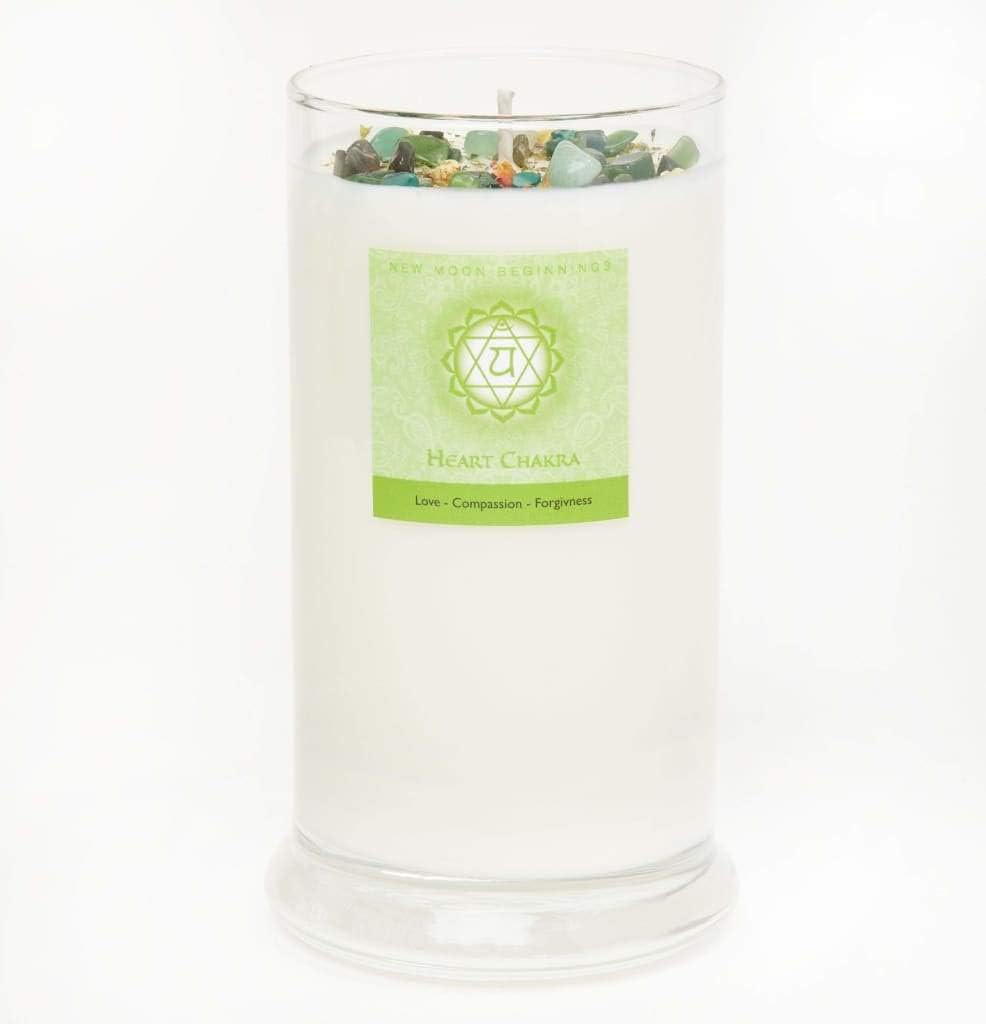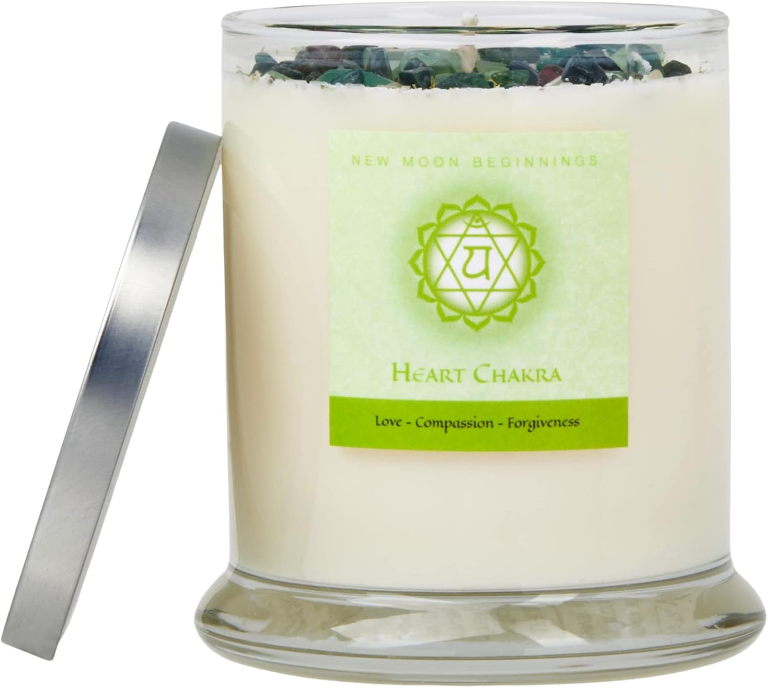Our Heart Chakra Candle was created to promote Love, Compassion, and Forgiveness. The Heart Chakra (The Anahata) is located in the region of the physical heart at the center of the chest. It is the center of sympathy, empathy, and love. When the heart chakra is balanced, one feels love and connection to self and others. Its the center of your spirit as well as the center of the chakras, making it a vital energy center forThe New Moon Beginnings spiritual, mental, and physical well-being. The Heart Chakra Candle has a Floral, Citrusy, and Sweet scent with Green Aventurine, Jade, Emerald, Bloodstone, and Malachite healing crystals on top. Handmade and Hand-poured with Soy Wax for a Long, Clean Burn!This listing is for a single (1) New Moon Beginnings Candle container or pack of tealights. New Moon Beginnings Candles are Handmade and Hand-poured in the USA. We use 100% Natural Soy Wax, Essential oils, Natural Fragrance Oils, and 100% Cotton Wicks (Lead-Free). Each candle is topped with Genuine Crystals and Stones, flowers, and herbs which are all mindfully selected to help set the intention of the candle.Size Options include: Tealights in a set of 6: Each Tealight is .75" tall and 1.5" in diameter7.5 oz. Glass Jar: 3 inches high and ~2.75 inches in diameter8 oz. Tin with lid: 2 inches high and ~3 inches in diameter12 oz. Glass Jar with lid: 3.5 inches high and ~3.25 inches in diameter21 oz. Glass Jar with lid: 6.25 inches high and ~3 inches in diameterBURN TIMES: Tealights: 4 to 6 hours per tealight7.5 oz: 20 to 30 hours8 oz: 20 to 30 hours12 oz: 40 to 60 hours21 oz: 80 to 100 hours