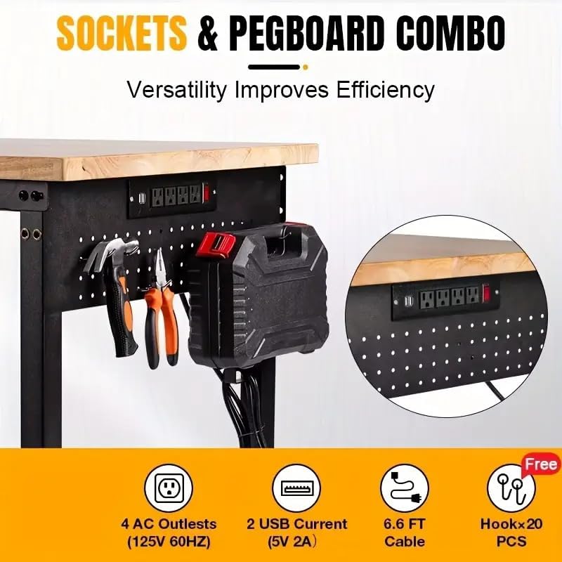 Transform your workspace with this versatile heavy-duty workbench that combines functionality and adaptability. The spacious 60x22 inch rubber wood top provides ample room for all your projects, while the robust steel frame offers exceptional stability. With 6 different height settings ranging from 28 to 40 inches, this workbench adapts to various tasks and user preferences. The integrated power solution features 4 AC outlets (125V 60HZ) and 2 USB ports (5V 2A), complete with a 6.6-foot cable for convenient power access. The thoughtfully designed pegboard backing comes with 20 free hooks, perfect for organizing tools and maximizing workspace efficiency. The sturdy construction boasts impressive load capacity, making it ideal for garage work, woodworking projects, or as a heavy-duty desk in your home office. The dual screw fixing system and adjustable feet ensure stability on uneven surfaces, while the black powder-coated frame adds durability and style. Whether you're a professional craftsman or DIY enthusiast, this workbench delivers the perfect blend of functionality and versatility.