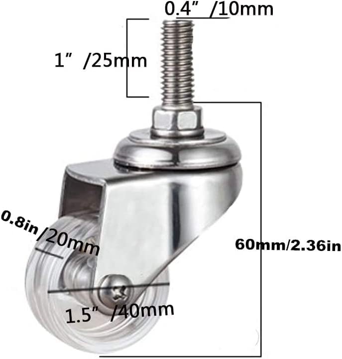 Why choose us?-Transparent threaded rod casters that can rotate 360 degrees. Smooth, heavy, quiet and sturdy.-Brake device, safe and stable.-Non-slip, wear-resistant and protect the floor from scratches.-Easy to operate and install, easy to clean and enjoy DIY fun.-With our transparent casters, your house looks new and full of vitality.-Suitable for home and small furniture, can improve efficiency and save time.[about that product]Material:transparent PC and 304 stainless steel bracketType: 100% brand newInstallation: threaded rod(M10)? 1.5in specifications:Wheel diameter: 1.5 inches / 40 mmRim width: 0.8 inches / 20 mmInstallation height: 2.4 inches / 60 mmThreaded rod size: M0.4x1 inch / M10x25 mmLoad: 75KG / 165 pounds (4)? 2in specifications:Wheel diameter: 2 inches / 50 mmRim width: 0.9 inches / 22 mmInstallation height: 2.8 inches / 70 mmThreaded rod size: M0.4x1 inch / M10x25 mmLoad: 105KG / 231 lbs (4)[package]4x casters?note?1. Due to manual measurement, please allow 0.01-0.02 inch error. Thank you.2. Due to the difference of light and screen, the product color may be slightly different, please refer to the actual product.3. Welcome to our store! If you want to know more about casters, please browse our store. It will be a pleasant shopping experience.
