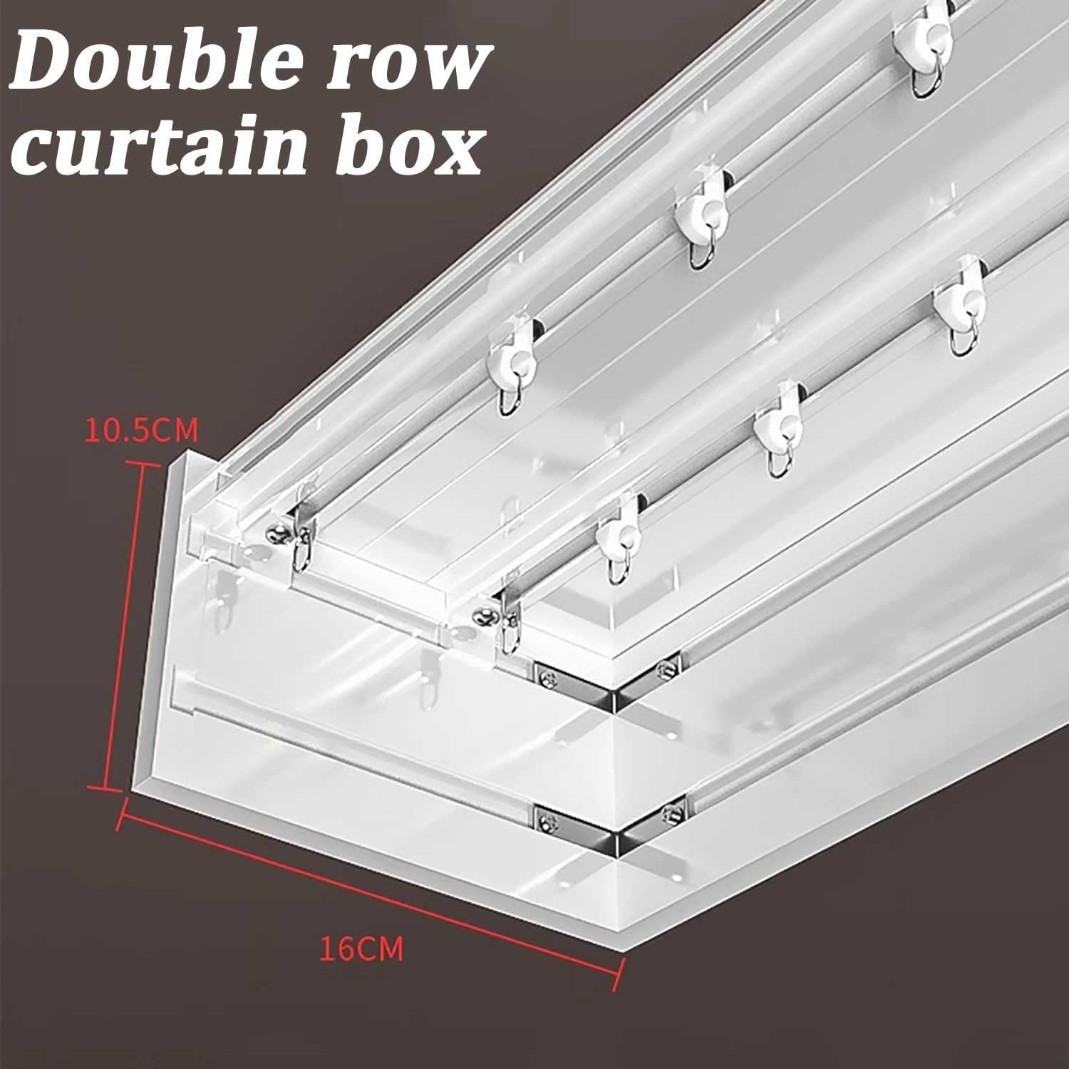 Name: Three-in-one curtain box/double curtain trackMaterial: aluminum alloyColor: whiteProcess: ElectrophoresisLoad capacity: 40kg (88lbs)Installation: top mountedHanging method: hook typeScene: living room, bedroom, hotel, hospitalPackage Included:1 x curtain track (including all accessories)Features:1.Suitable for all types of curtains.2.Slides smoothly and won't get stuck.3.Can be easily cut to customized length with hacksaw.4.Elegant appearance, make the room look neat and tidy.5. Heavy duty: even suitable for heavy duty blackout curtains.6.Enough sets to eliminate the hassle of buying different components of curtain track separately.Warm tips:Due to the limitation of the logistics length, the curtain track that exceeds the limitation length needs to be installed in sections, we have special curtain track connectors that can be used between the tracks without affecting the curtain track, and we will send the connectors to you in the package.Due to different manual measurement methods, the error is 1-2 cm.We try our best to make the pictures close to the real thing, but the light, contrast and color display may cause color difference.