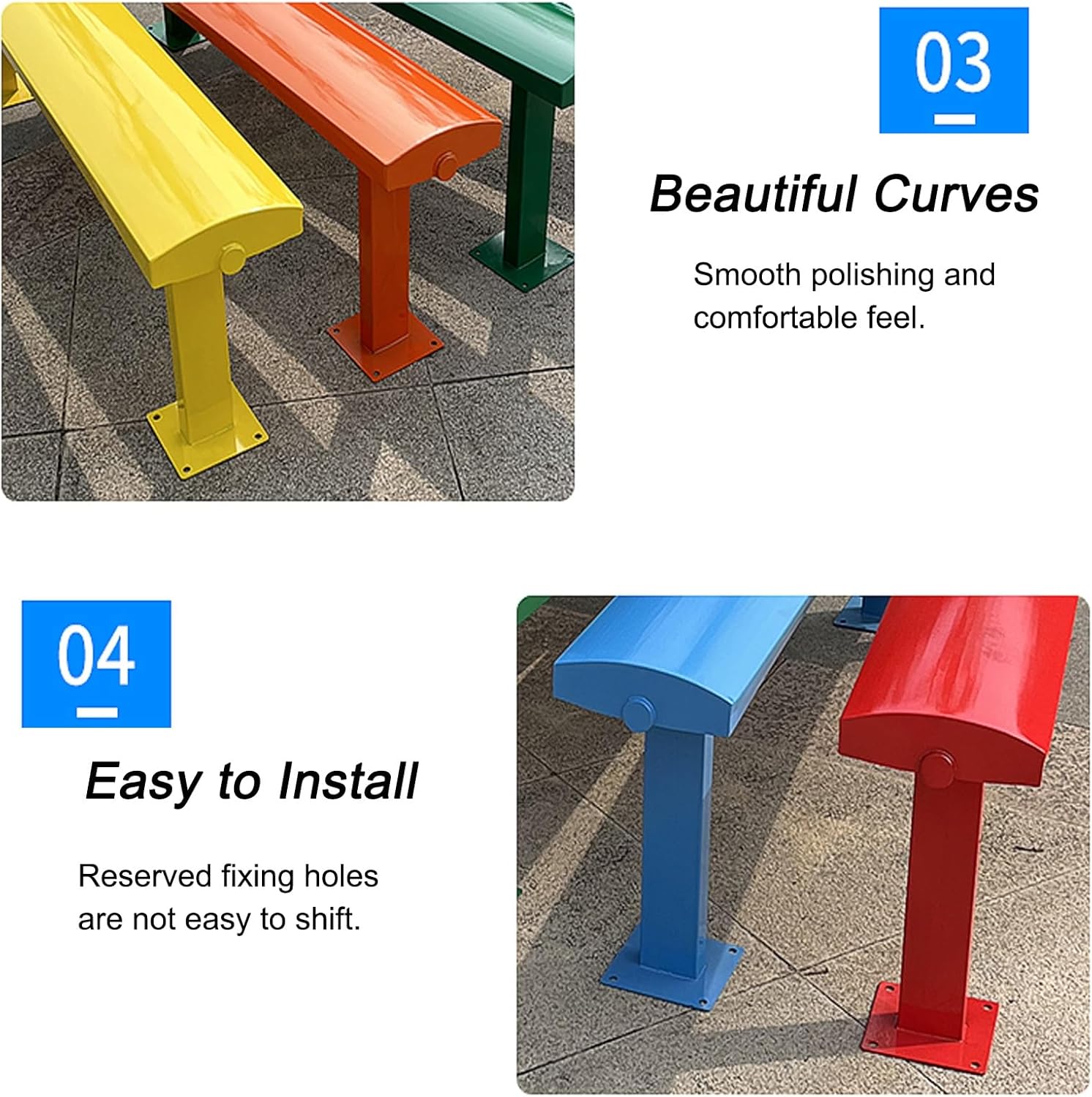 Park Bench:Enhance your outdoor space with our stylish and durable garden bench, designed to bring a splash of color and comfort to parks, gardens, and courtyards. This modern outdoor bench combines aesthetic appeal with functionality, making it a perfect addition to any outdoor setting. **Key Features:** - **Durable Construction:** Made from galvanized steel, our garden bench is both sun-proof and rust-proof, ensuring it withstands the elements for years to come. - **Stable and Secure:** The robust design guarantees stability, providing a safe place to relax without any wobbling. - **Ergonomic Comfort:** Enjoy long hours outdoors without discomfort, thanks to the ergonomic design that supports your body while you sit. - **Easy Maintenance:** The smooth surface allows for quick cleaning with just a simple wipe, making it easy to keep your bench looking great. **Specifications:** - **Material:** Galvanized Steel - **Color Options:** Available in vibrant Blue, Brown, Green, Orange, Red, and Yellow - **Type:** Outdoor garden bench - **Load-bearing Capacity:** Supports up to 660 lbs - **Service Life:** Designed for longevity with an estimated lifespan of twenty years **Size Options:** - **Highest Point to Ground:** 18" - **Total Length Options:** - 39" (Seats 1-2 people) - 47" (Seats 2-3 people) - 59" (Seats 4-5 people) - 71" (Seats 5-6 people) - **Seat Plate Depth:** 9" - **Leg Size:** 2" x 3" - **Base Size:** 6" x 6" **What’s Included:** - 1× Garden bench - 1× Mounting accessories - 1× Installation Instructions Transform your outdoor area into a vibrant and inviting space with our garden bench, perfect for gatherings, quiet moments, or simply enjoying the view.