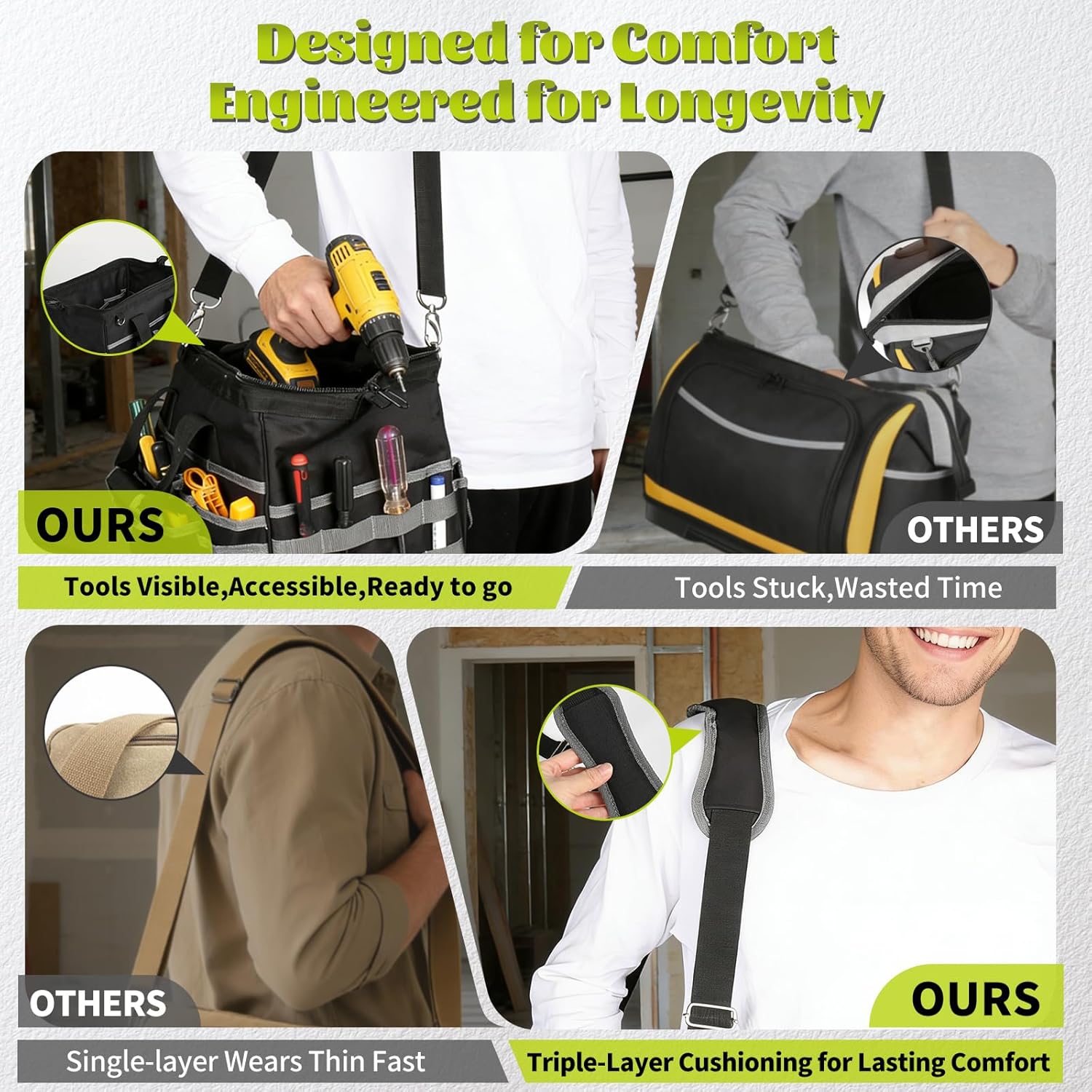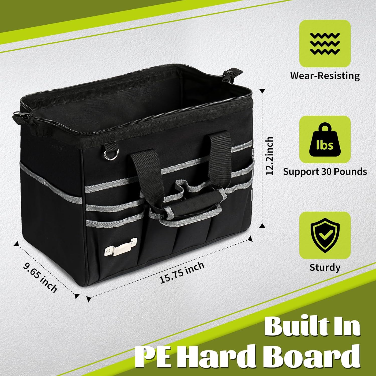 Waterproof & Tough: Constructed from 600D Oxford fabric with PVC waterproof coating. The tool bag is waterproof, tear resistant, scratch resistant, and wear-resistant, providing long-lasting durability and protection for your tools in any weather or job site