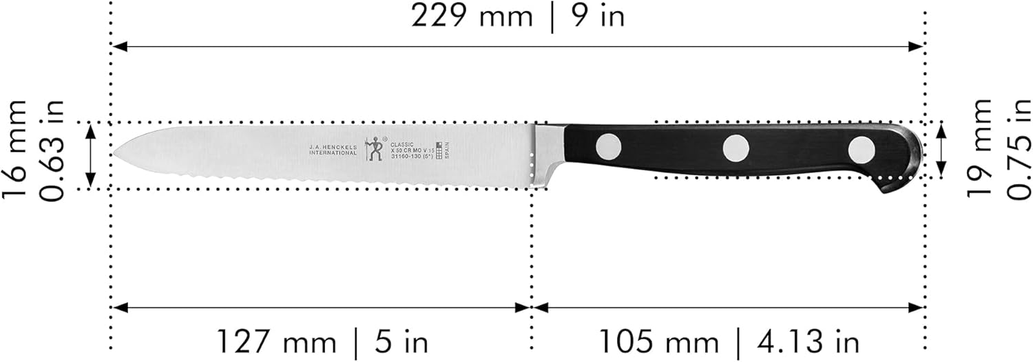 Product Description PRODUCT DESCRIPTION The Henckels CLASSIC 5" Serrated Utility Knife allows you to cut with confidence. Fabricated from high quality German stainless steel, the serrated blade deftly slices through foods with a hard exterior and soft interior. Cut tomatoes, sausages, bread and cheese effortlessly - this small, versatile knife is perfect for picnics, too.With a seamless transition from blade to handle, the knives' fully forged construction provides balance as the traditional triple-rivet handles encourage tireless cutting.Henckels makes essential kitchen tools every home chef needs. From steak knives to spatulas, every product boasts high quality at an exceptional value. Created in 1895 by Zwilling J.A. Henckels, this value-driven brand guarantees the same durability, design and ease of use for which the global company is known. Equip your kitchen with expertise with Henckels. AMAZON.COM Along with a chef's knife, a small, serrated utility knife becomes a regular kitchen companion, especially in the summer, when there's a bounty of fresh tomatoes, peaches, and other juicy fruits and vegetables. Perfect for slicing without squashing, the knife's sharp-edged serrations slice right through soft breads as well--it's perfect for biscuits or English muffins. The slender, sturdy handle, good balance, and minimally flexible blade make this an excellent value, and it's got the same lifetime guarantee as other Henckels products. While you can throw it in the dishwasher with your other utensils, using the top rack may be a safer bet--this blade is sharp! --Jill Lightner Amazon.com Along with a chef's knife, a small, serrated utility knife becomes a regular kitchen companion, especially in the summer, when there's a bounty of fresh tomatoes, peaches, and other juicy fruits and vegetables. Perfect for slicing without squashing, the knife's sharp-edged serrations slice right through soft breads as well--it's perfect for biscuits or English muffins. The slender, sturdy handle, good balance, and minimally flexible blade make this an excellent value, and it's got the same lifetime guarantee as other Henckels products. While you can throw it in the dishwasher with your other utensils, using the top rack may be a safer bet--this blade is sharp! --Jill Lightner