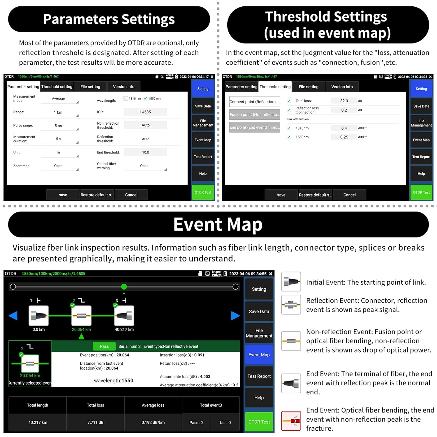 • 【Curve Analysis & Shortest EDZ ADZ & Data Storage】The OTDR fiber tester can analyzes the curve automatially,touch screen zoom or move curves operation.The tested results are displayed in the form of a list.Event list clearly reflects the type of event,distance,loss,decay,reflection. Shortest event dead zone (1.6m) and attenuation dead zone (8m). Support automatic or manual save the most of 4 traces simultaneousiy,creat trace reports to the storage path.SOR standard file format PDF/EXCEL.