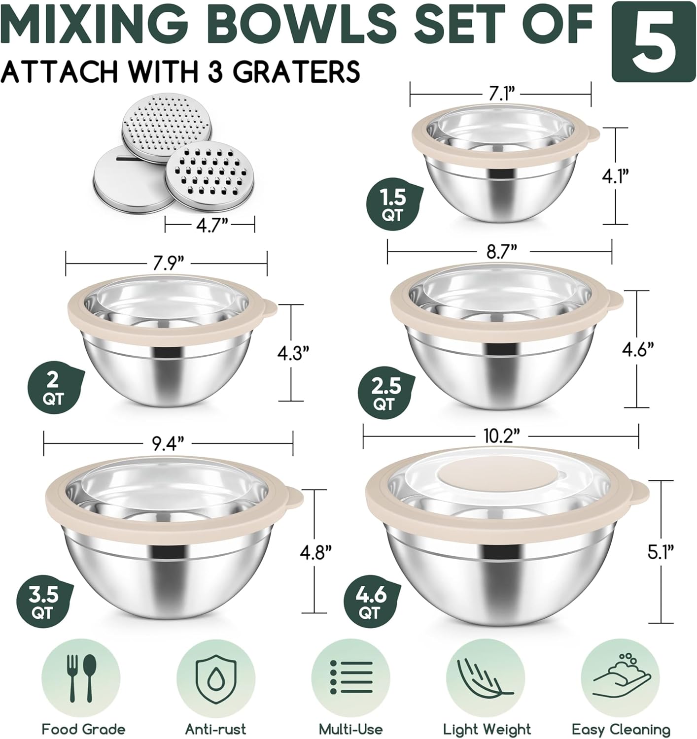 Herogo 5-Piece Mixing Bowls with Lids, 24 Pieces Modern Round Dinnerware, Khaki