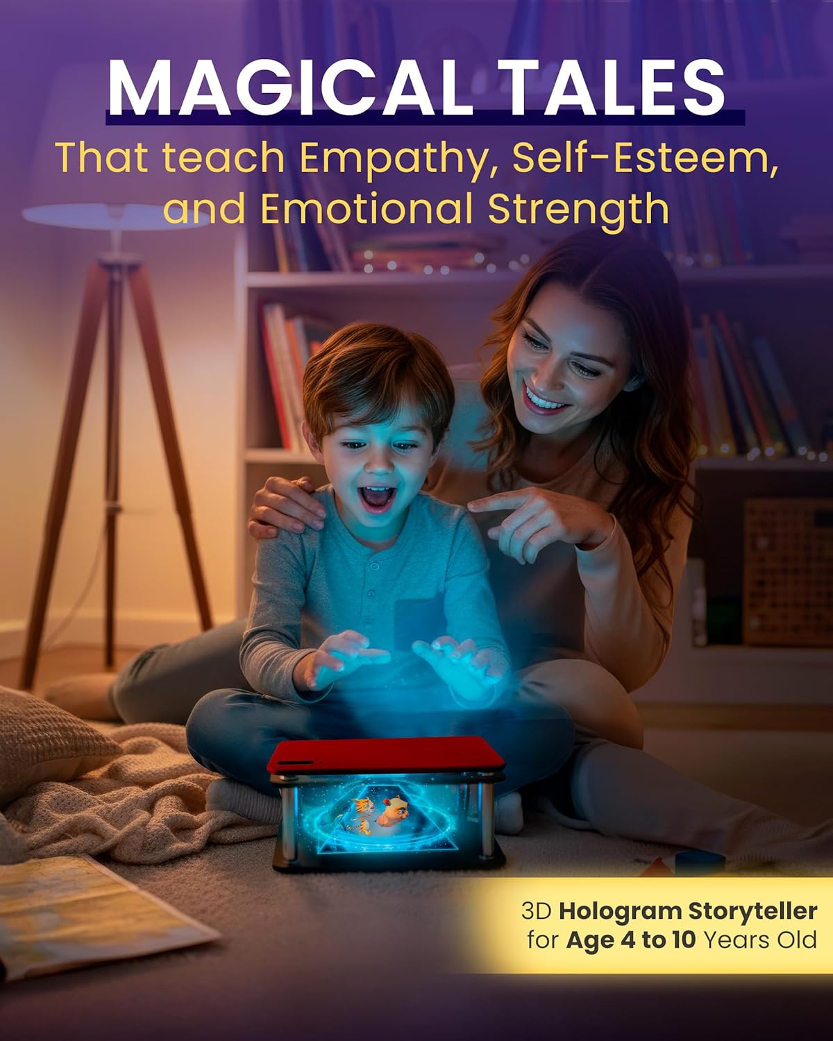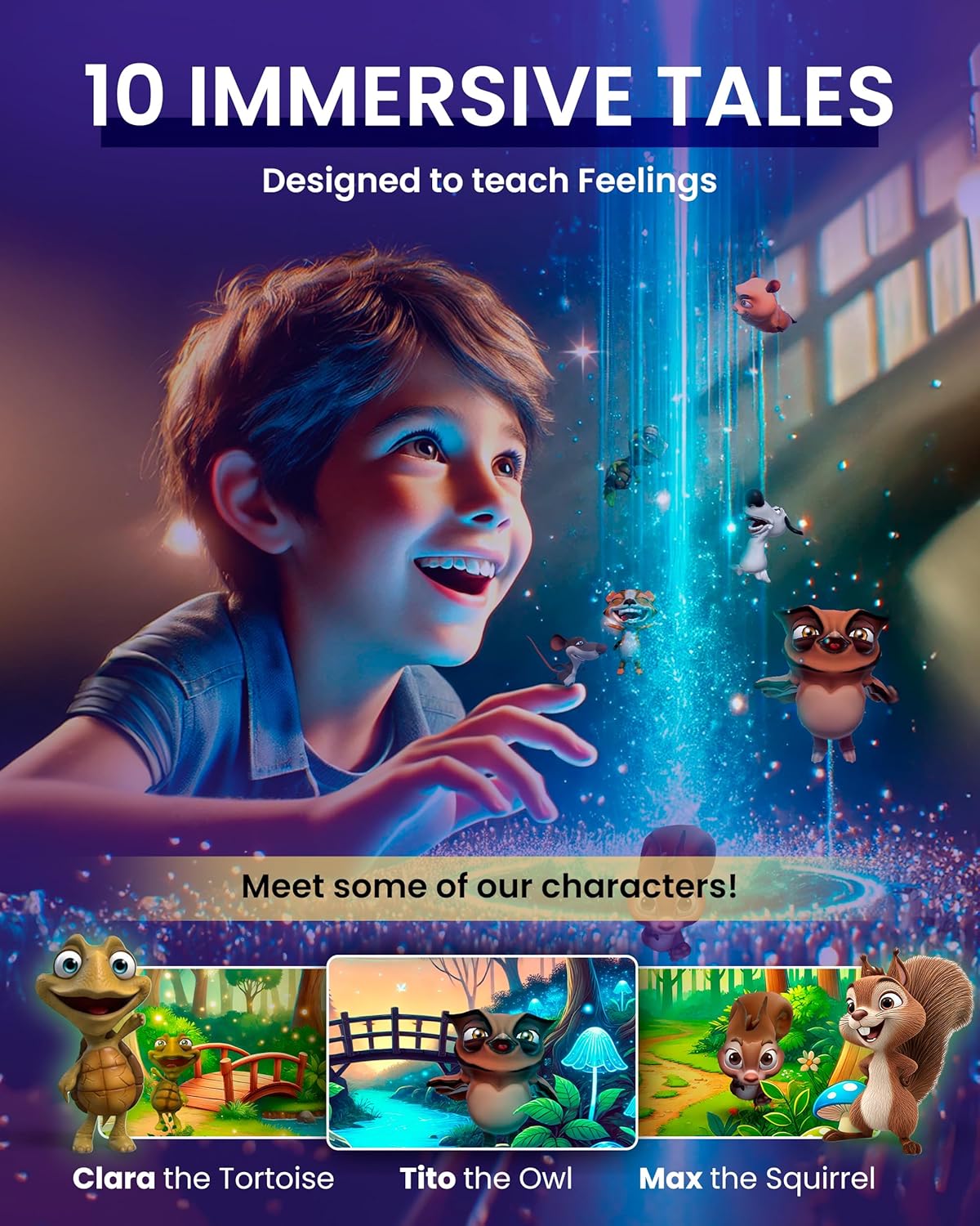 • ๐ŸŒ LISTEN TO STORIES IN 5 LANGUAGES: EN, ES, FR, DE, IT. Narrated by professional native speakers. Switch languages anytime in the app. Natural exposure to other languages while they enjoy magical 3D hologram stories.