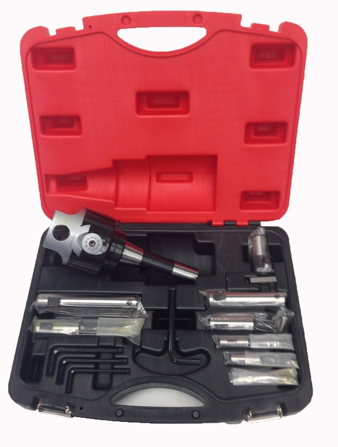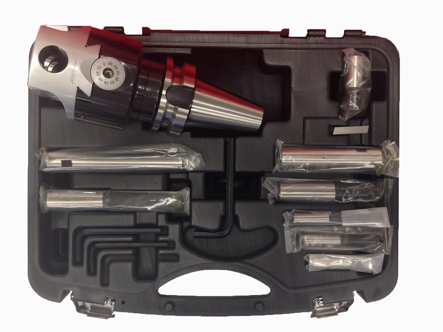 Pro-Series BT40 3" Head Boring Tool Set ~ Made In Taiwan ~ Wide bearing surface provides Super accuracy. ~ Rugged design allows excellent rigidity for chatter-free boring. ~ Head features a threaded back for use with multiple shanks. ~ Set complete with Boring Head, Boring Shank, Boring Bars, Adapters and L-shape Hex Wrenches. ~ Dial on head with 0.0005" graduation for accurate hole sizing. ~ Fitted durable carry case included.