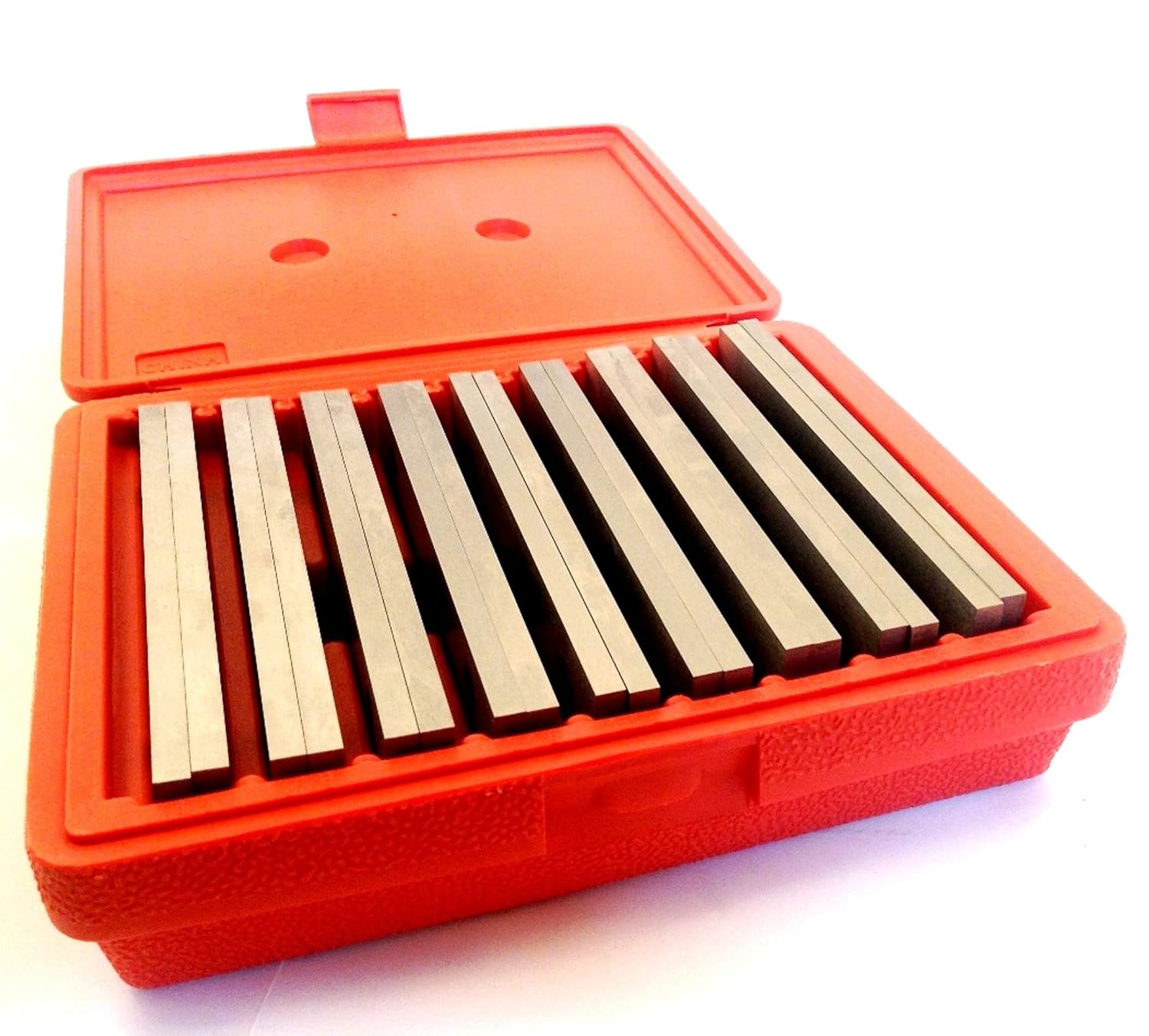 HHIP Precision parallel set includes 3/16" x 1" x 6", 3/16" x 1-1/4" x 6", 3/16" x 1-1/2" x 6", 3/16" x 1-3/4" x 6" size. Made from fine qualify tool steel stress relieved against distortion, precision ground and hardened. These precision parallels are recommended for layout work, standards and set up. The holes are designed for easier handling and set ups. Hardness: case hardened RC 55 to 62 on 2 sides, top and bottom only. Complete with fitted durable plastic case. Tolerance: Parallel To 0.0003 on 2 sides, top and bottom. Dimensions: within 0.001" allowance.