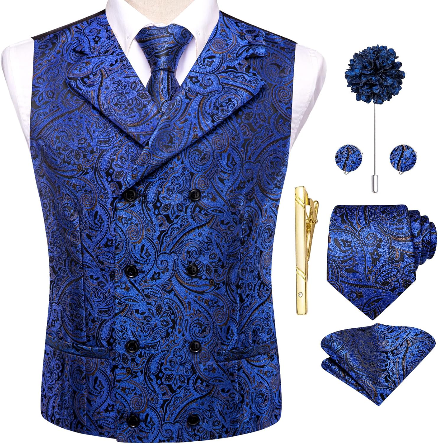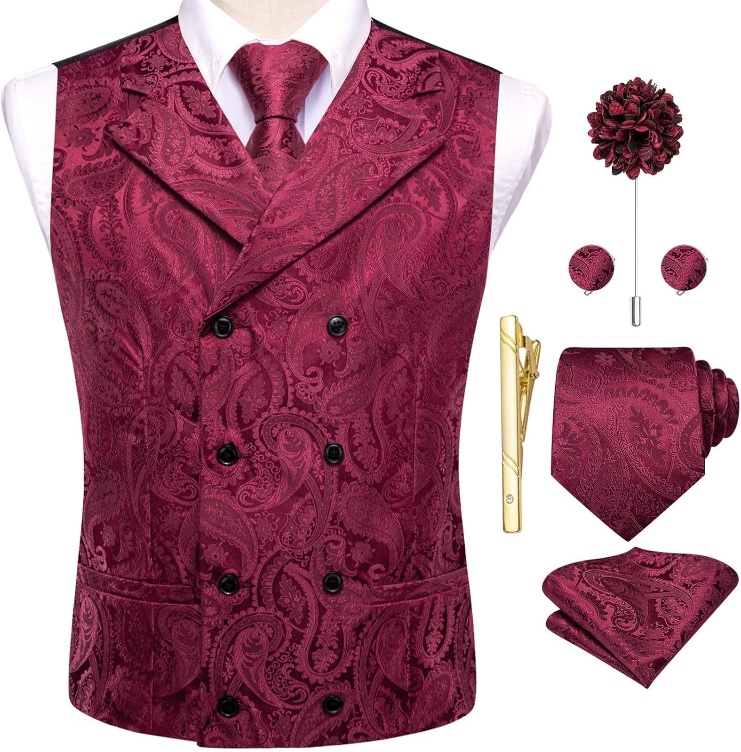 • Vest Set: Including 1 Double Breasted Victorian Vest + 1 Neck Tie + 1 Pocket Square + 1 Pair Cufflinks + 1 Flower Lapel Pin + 1 Gold Tie Clip.