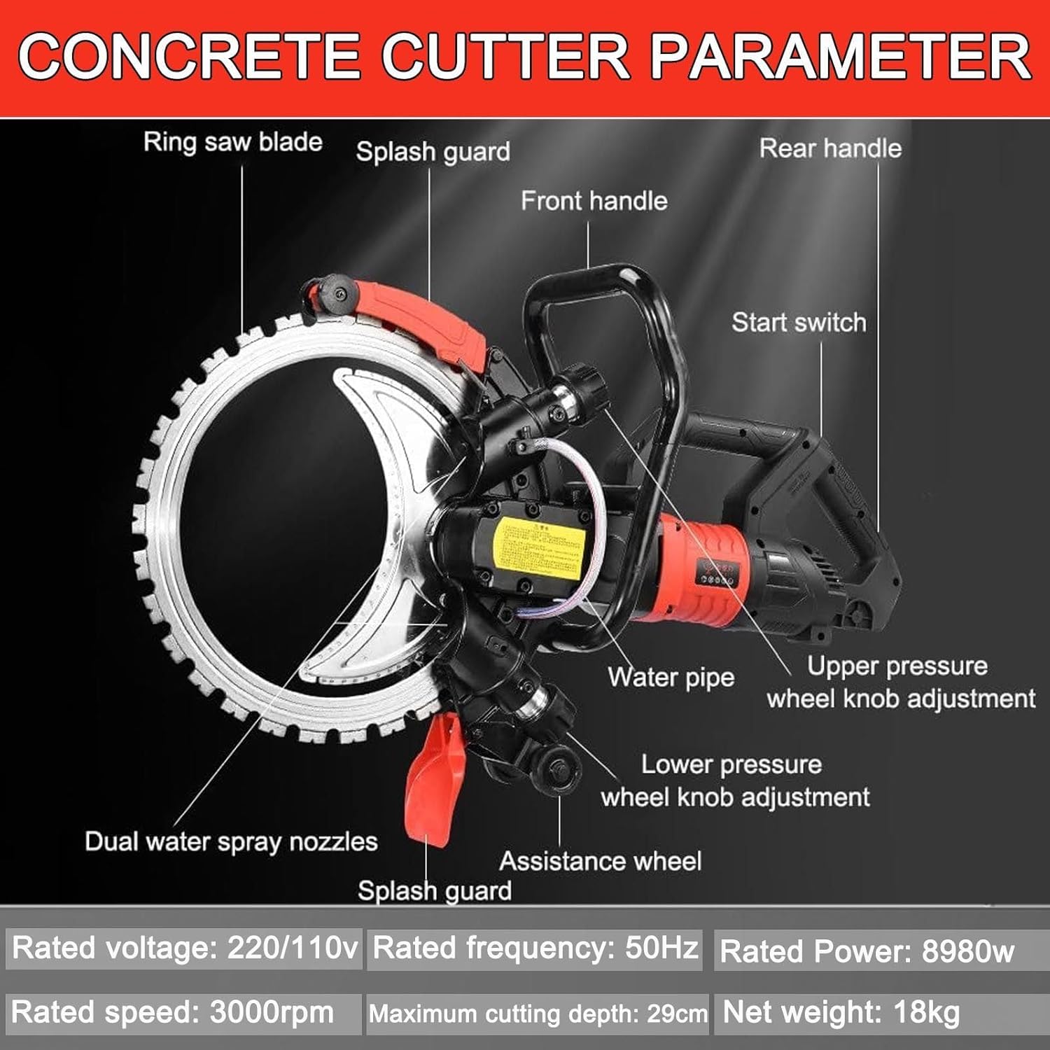 Transform Your Worksite with Precision & Power Unleash unmatched cutting efficiency with the 8980W Toroidal Electric Concrete Saw, engineered for professionals who demand speed, precision, and cleaner workspaces. Whether slicing through granite countertops, concrete walls, or porcelain tiles, this industrial-grade saw delivers cuts at 3000 RPM—completing 2 meters in just 3 minutes. Paired with a water-fed dust suppression , it’s not just a tool—it’s your partner in productivity and safety. APPLICABLE PERSONNEL Construction crews tackling deep walls or foundations Masonry professionals crafting countertops or pavers Renovators slicing through tile, stone, or reinforced concrete Landscapers shaping stone or wood features Home and Commercial SPECIFICATIONS Name: Circular Saw Rated Power: 8980W Blade: 16” Diamond Ring Saw Blade Speed: 3000 RPM Cutting Depth: 29cm power cord:2.5m Dust Control: Water-fed suppression Applications: Granite, Concrete, Porcelain, Wood, Stone PACKAGE INCLUDE Concrete Ring Saw*1