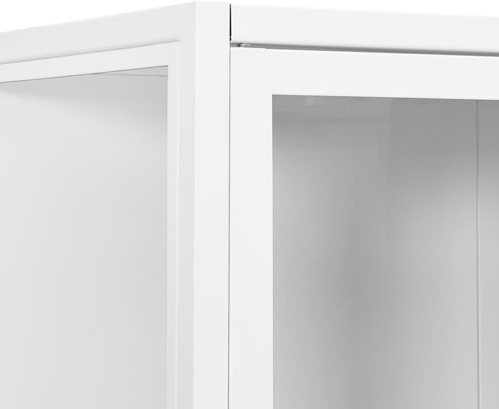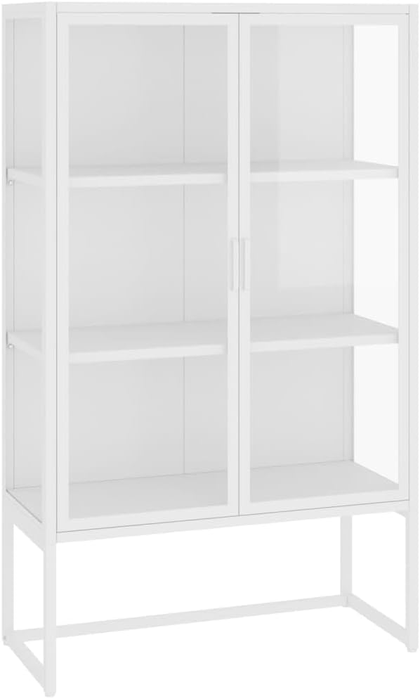 This highboard with practical design is a real eye-catcher for your home decor.The storage cabinet, featuring a steel construction, is sturdy for long-term service. It features levellers on the bottom so that you can adjust the height according to your need. The side cabinet has 2 glass doors with adjustable shelves inside, providing ample space for storing books, magazines and other personal essentials.Color: WhiteMaterial: Steel, tempered glassDimensions: 31.5" x 13.8" x 53.1" (L x W x H)Loading capacity per shelf: 66.1 lbTotal loading capacity: 198.4 lbAmount of shelf: 2 (adjustable)Features levellers on the bottomAssembly required: Yes