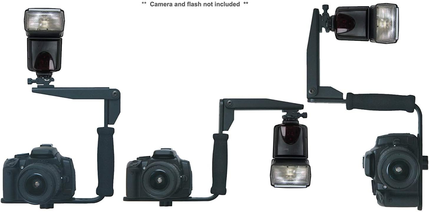Center your camera on the bracket and attach, like you were mounting your camera on a tripod. The bracket comes with a shoe mount for your camera. Loosen the clamping screw, slide flash into mount and tighten snugly. Connect flash to camera with appropriate PC or type-specific cord. For horizontal shooting, the flash arm stays in the downward position. This seperation between your lens and flash eliminates red-eye and softens shadows. For vertical format, rotate the flash arm 180 degrees. The flash will be repositioned to again be centered high above the lens.