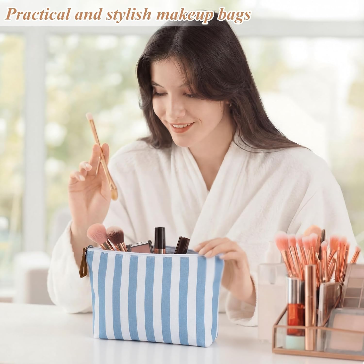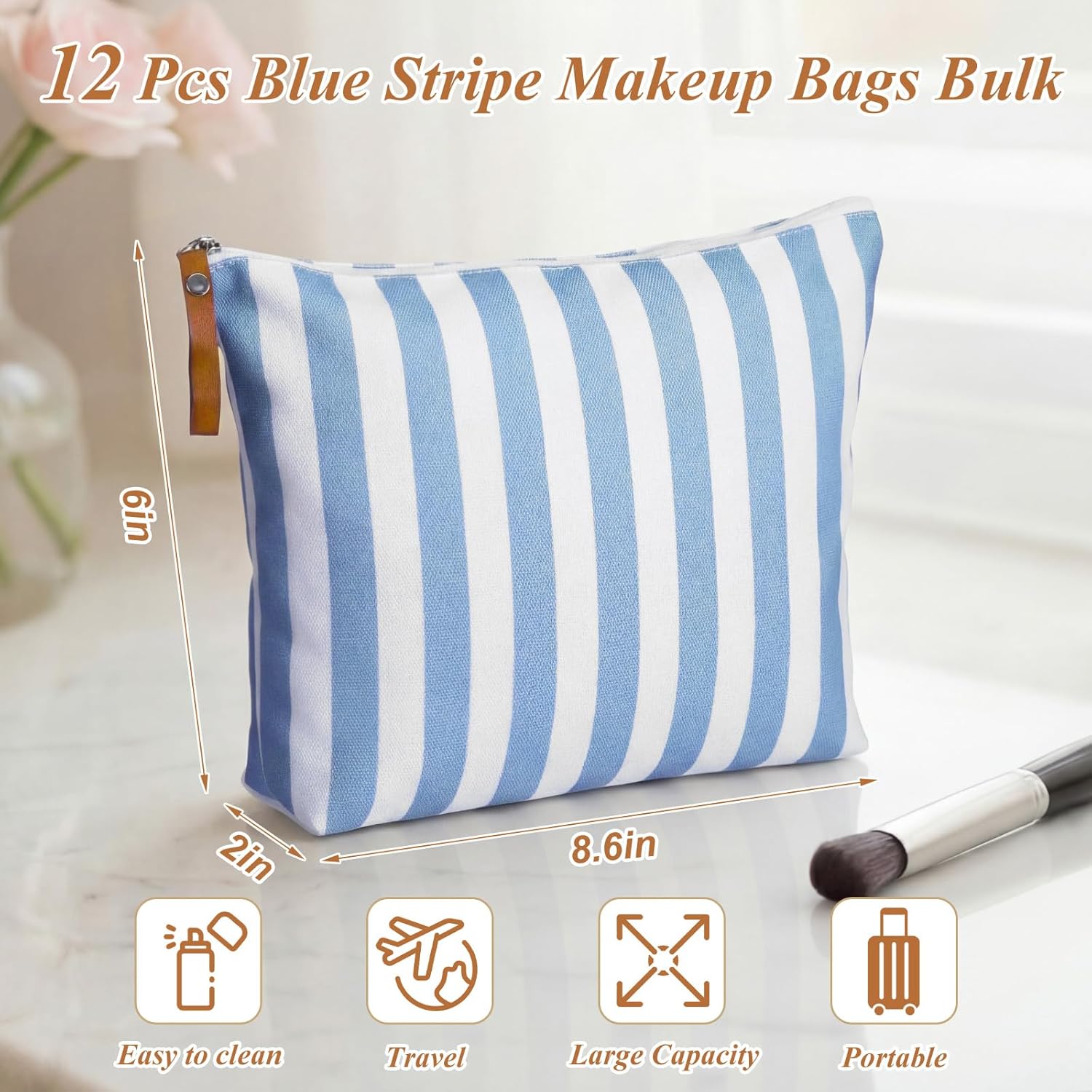 Features: Exquisite Design: The unique and elegant design makes this blue striped cosmetic bag stylish and glamorous, perfectly showcasing elegance and aesthetics. Lightweight and portable: This striped cosmetic bag is easy to carry and is perfect for everyday use, shopping, short trips, and outdoor activities to store essentials. Specifications: Material: canvas Color: blue White Size: 9.84 x 7.87 x 1.97 inches Package includes: 12 x Blue striped cosmetic bag Notes: Manual measurement, please allow slight errors on size. The color may exist a slight difference due to different screen displays