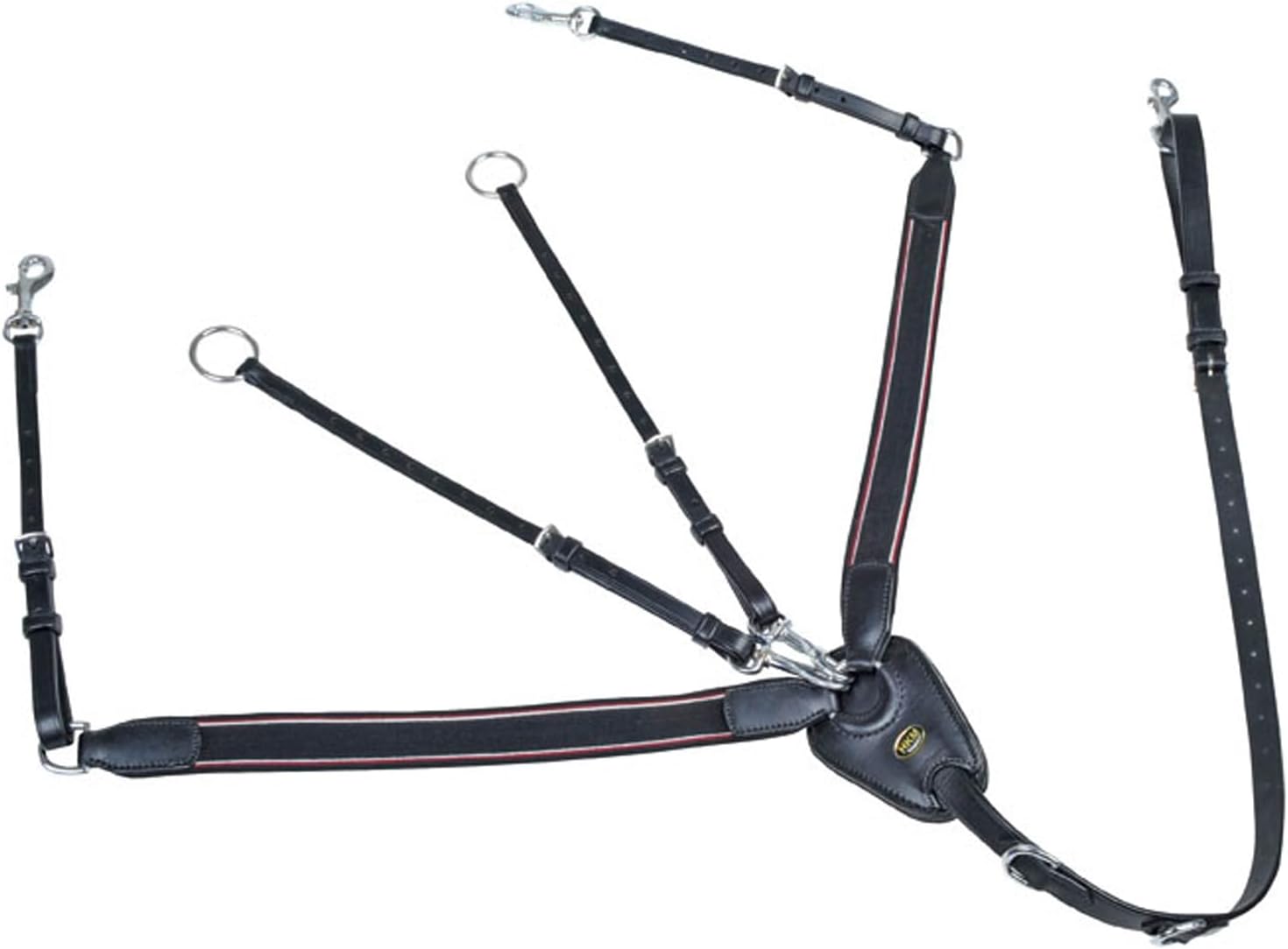 Product Description Features: - Removable martingale fork - stable, silver-coloured fittings - softly padded at the pressure points - chrome-plated metal fittings - elastic insert - optimal size adjustment thanks to variable adjustmentMaterial: - quality leather Set Contains: 1x breastplate with martingale and wide rubber
