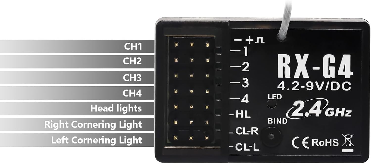 Features:Suitable for Hobby Fans 4CH Transmitter2.4G Technology: 2.4G technology, FHSS 67 channels frequency-hopping spread spectrum, highly resistant to anti-jammingFast Response: The receiver response time is 2ms, ensuring a fast response and better controlCompatible with: Compatible with a variety of vehicles, suitable for RC cars, RC boats and RC tanksLight Control System: With built-in light control system, easy to control head light, right cornering light and left cornering lightSpecifications:Channels: 4Frequency: 2.4GHzPackage List:1 * Receiver