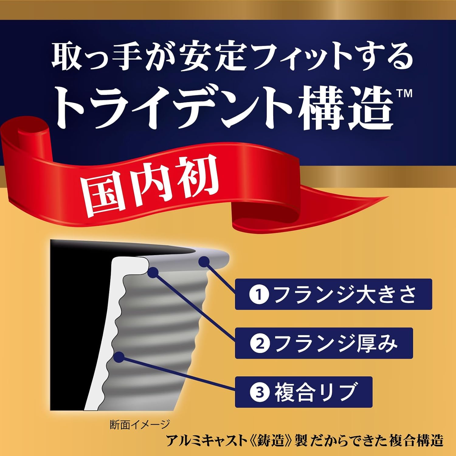 Workmanship Handle Frying Pan Made of cast aluminum with an evenly heated finish that allows for even baking without any unevenness. Japanese quality coated mug Daikin Silkware EZ Stable fit Trident Structure (First in Japan) Made of cast aluminum for a composite structure
