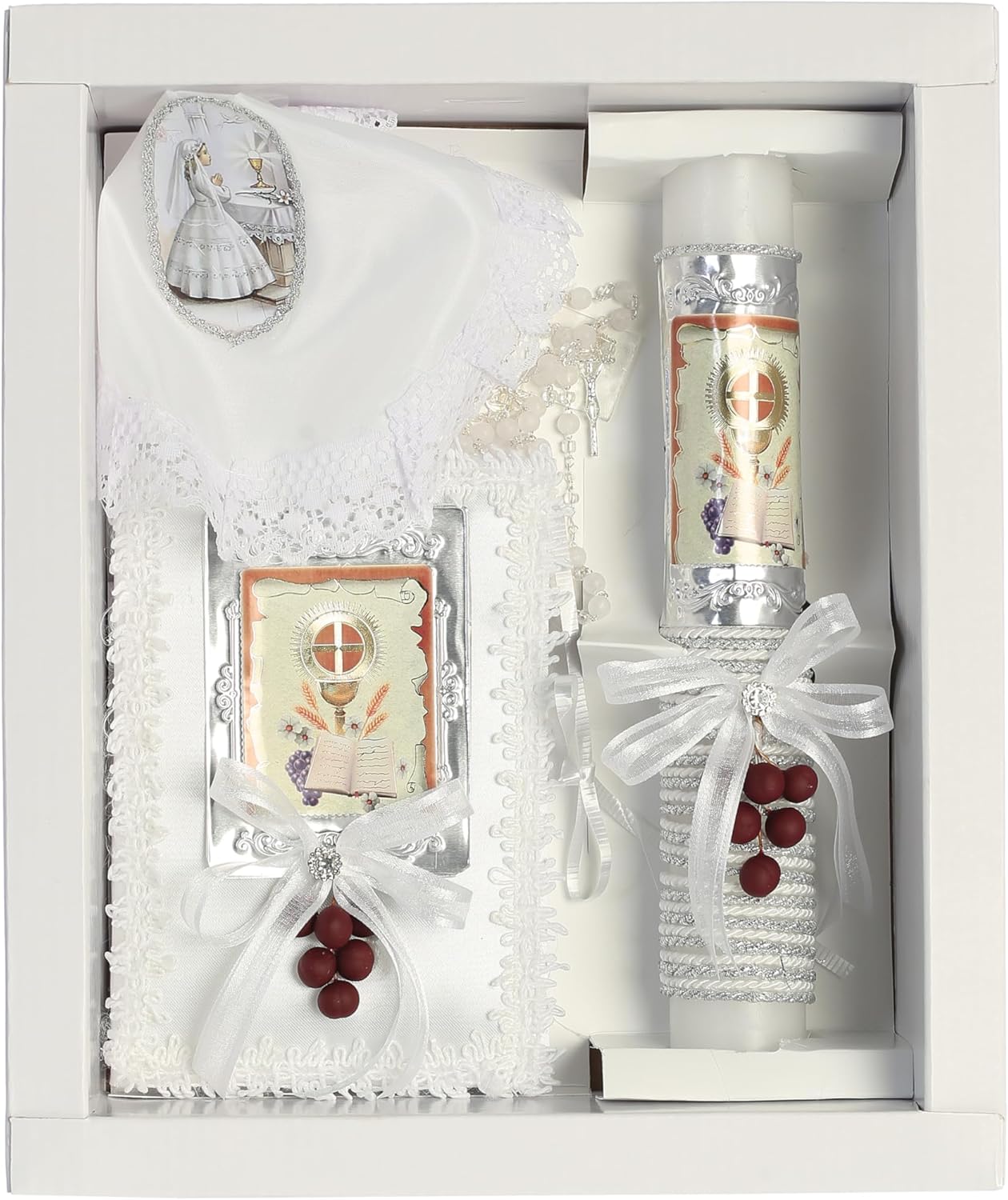 This first communion candle set for girl comes with 4 pieces: a communion candle, a English New Testament Bible, rosary, and a white handkerchief with silver embellishment that is Made in Mexico. The communion candle is 10 inches long comes with a beautiful gold cross with orange background, a golden chalice, wheat and a bible, burgundy grapes, a pretty white bow with flowers and rhinestones, and white and silver cording at the bottom of the candle. The 1st communion bible is 4 1/2" X 6 1/2" and also has the same exact background as on the candle. The clear rosary with cross matches the set well. The communion white handkerchief features a girl praying in front of an altar with silver embellishment. Makes a great gift from the Godmother or Godfather. Velas para primera comunion, velo para primera comunión, vela primera comunion niñas, libro y rosario y vela para primera comunion candle first communion candles with crosses vela de primera comunion para niño velas de primera velas para primera comunion de niños first communion gift set velas de primera comunion catholic 1st communion gifts first communion gifts set religious candles catholic candles cross candle 1st holy communion gifts for girls first holy communion gifts for girls catholic gift set velas de primera comunion para niñas vela para primera comunion para niña velos para niñas de primera comunion first communion set for girl fist communion sets girl catholic candle velo para primera comunion de niña first communion bible and rosary set girls holy communion sets velo de primera comunion para nina