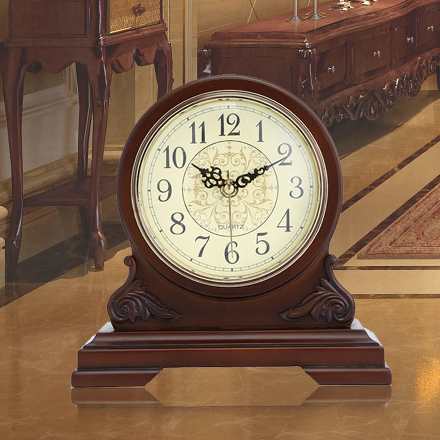 Mantel Clock, Silent Decorative Wood Mantle Clock Battery Operated, Wooden Design For Living Room, Fireplace, Office, Kitchen, Desk, Shelf & Home Décor Gift ★ Features: ★ Whether you need a clock for your mantel, shelf, table or living room decor, we know you want and deserve the best. ★ These mantel clocks have been around for many decades and will continue to display its elegance in people homes. ★ Its simplicity and astonishing appearance is what made these clocks so precious and demanding. ★ Carefully crafted with an antique expression, it is a piece of furniture you will always love to have or give as a gift to someone special. Specification: Product category: table clock Whether double-sided: single-sided Style: European style Display type: pointer + number Sweeping movement: the origin of the movement Shell material: wood Mirror material: ordinary glass mirror Package Contents: Table clock*1