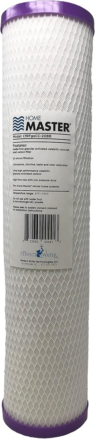 Product Description This Radial Flow GAC water filter (model CFRFGAC20-20BB) fits all Home Master Whole House water filtration systems, as well as 20-inch Big Blue filter housings. Offering ideal carbon filtration for high flow applications, the filters coconut shell activated carbon provides improved taste, smell and purification, and its radial flow design provides excellent iron reduction with minimal pressure drop (<1 PSI pressure drop). It also removes up to 95-percent of chlorine, chemicals, taste, and odors. This filter has a typical lifecycle of 100,000 gallons (or 1 year). It measures 20 x 4-1/2 inches, and it has a 1-inch center hole. This filter is not designed to treat microbially unsafe or non-potable water without adequate disinfection before and after unit. Operating conditions: pH 4 - 10; feed water PSI 20 - 100 PSI; water temp 40 to 100 degrees F; 2000 ppm maximum total dissolved solids. From the Manufacturer Whole House Granular Activated Coconut Shell Carbon Water Filter -, 20 micron, 20-Inch x 4.5-Inch. Fits: Home Master Water Filter, 20-Inch Big Blue filter housing. Coconut shell activated carbon for improved taste, smell and purification. Ideal carbon filtration for high flow applications. Radial Flow design provides excellent chlorine and chemical filtration with minimal pressure drop (<1 psi pressure drop). Removes up to 95-percent of chlorine, chemicals, taste, and odors. Typical lifecycle: 100,000-Gallon or 1 year. Dimensions: 20-Inch x 4.5-Inch ; 1-Inch center hole. In the box: Replacement filter cartridge