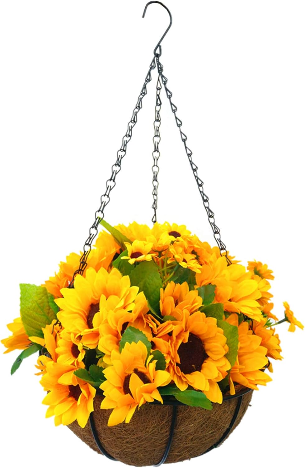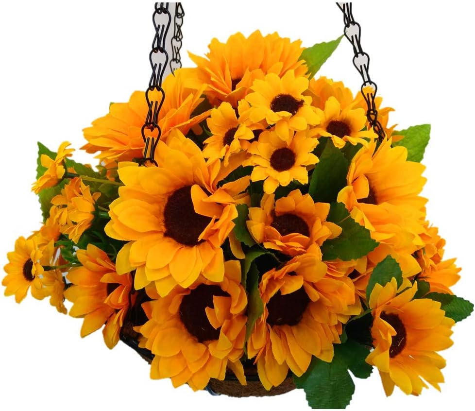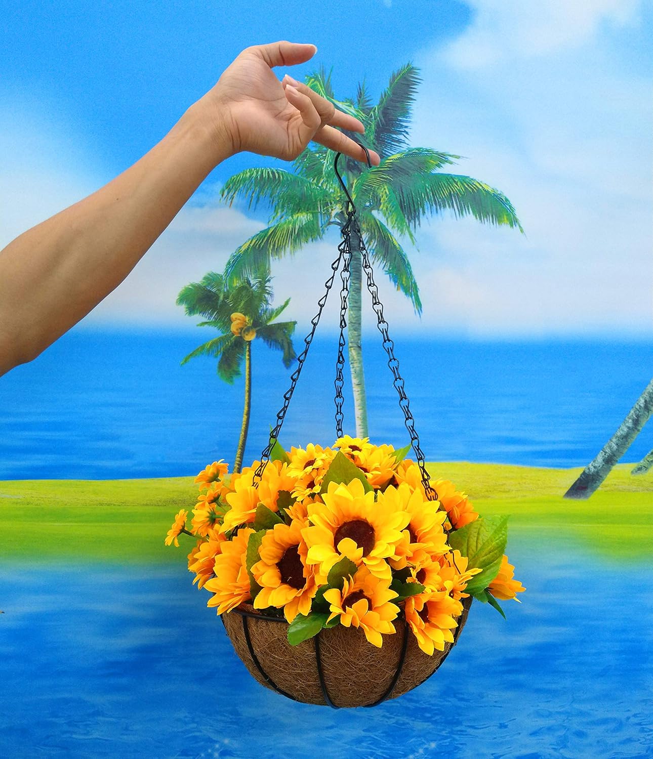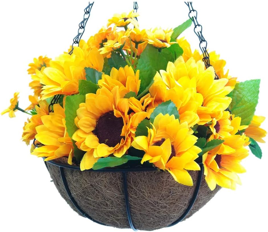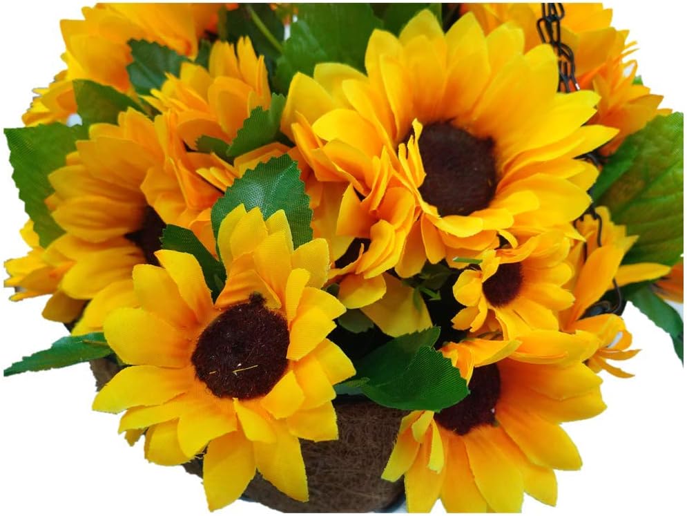 Hanging Basket with Artificial Grass and Silk Sunflower Color: Yellow and Green. Weight: 800g(9.85 Inch),Weight: 600g (7.8 Inch)Material: silk flowers,Coco liner, metal basket. 9.85 Inch Size: The whole length is about 50CM/19.7" and the width(DIAMETER OF BASKET) is about 25CM/9.85".7.8 Inch Size: The whole length is about 45CM/17.5" and the width (DIAMETER OF BASKET) is about 20CM/7.8"Decoration for home, office, porch, hotels, guesthouses, wedding party.Note: all the products pictures are photographed by our photographer, these are DIY products, you could play your own imagination, on the basket, you can use these flowers to assemble and design your favorite shape, and then hang in different places, will make your place vibrant, spring-like, charming. Every one would like it very much.