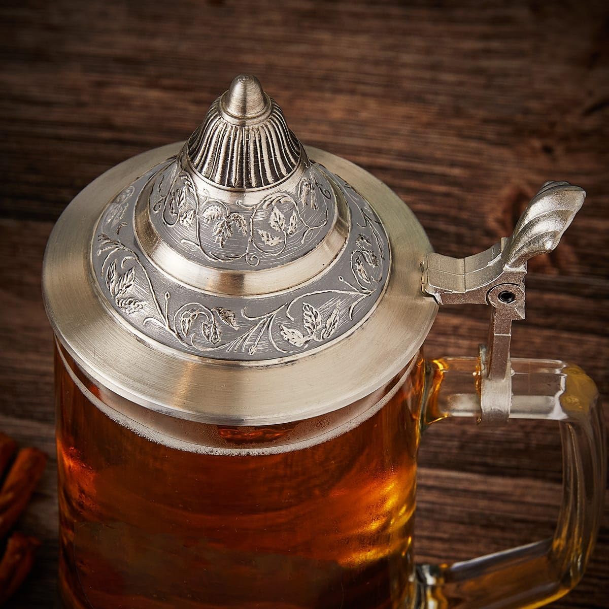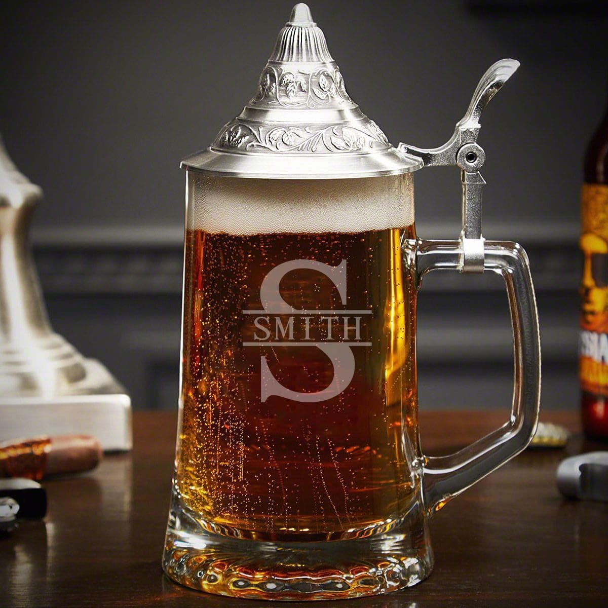 In bierhauses all over the world, songs are being sung, steins are clashing together, beer is being spilled all over the floor, and everyone there wouldn’t have it any other way. Now you can bring the bierhaus to your home with a traditional German beer stein. The pewter lid catches the eye and allows you to enjoy your beer outside without fear of anything following in. The crest, personalized with two lines of your choice, lets everyone know how much you enjoy a refreshing beer. They also make great gifts for any beer lover. Each traditional German beer stein measures 9.5 x 4.75 x 4.75 and holds up to 16 ounces.