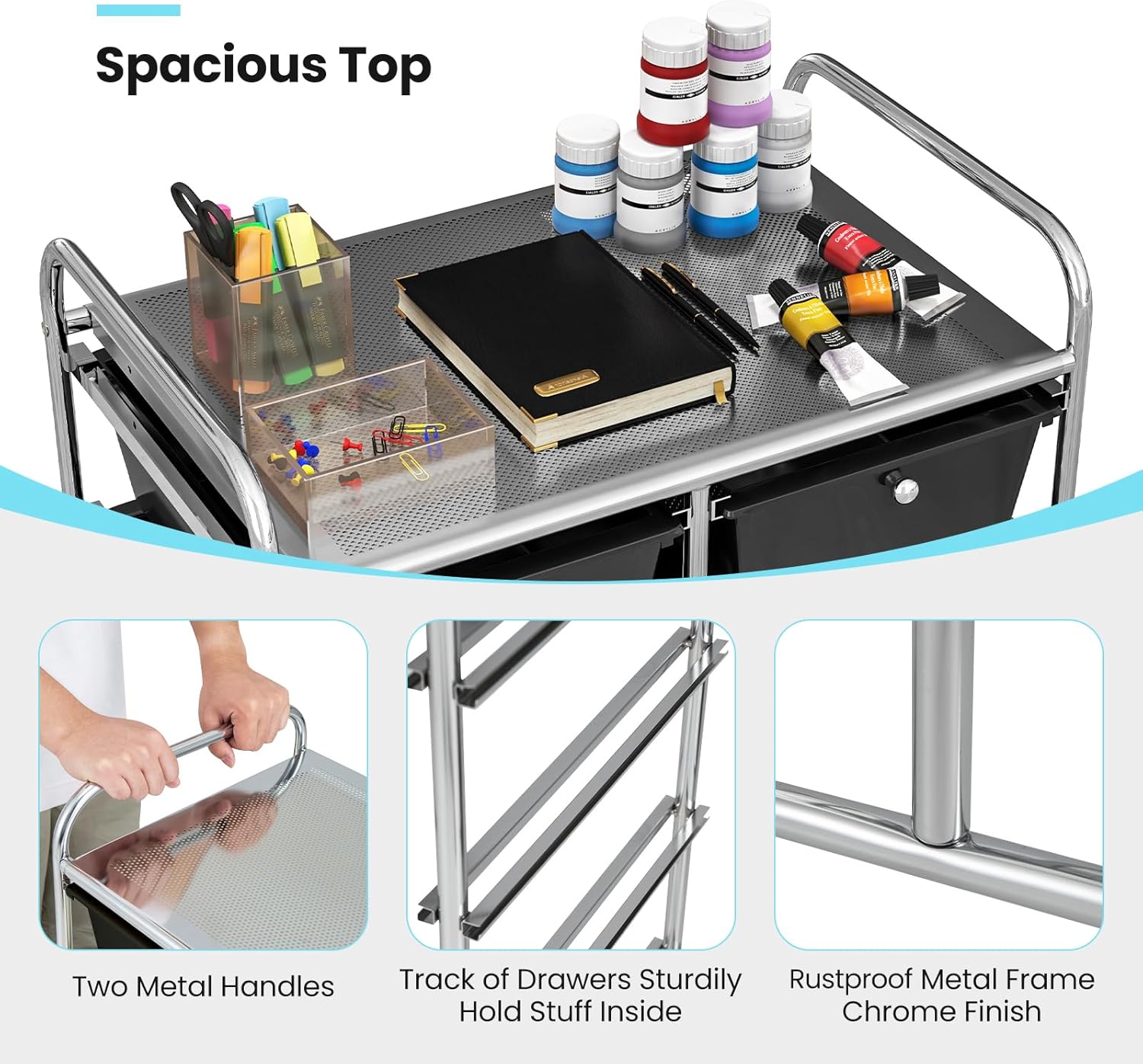 Descriptions:Are you looking for a storage cart to place your files in order? HOMGX drawer cart is a good choice!HOMGX rolling storage cart is a versatile and practical solution for organizing and storing your belongings. With its 10 spacious drawers, larger than A4 paper size, it provides ample space for paper, documents, or children's toys. The cart is supported by a durable chrome finished steel frame, capable of holding up to 22lbs. The utility cart features portable handles, convenient knobs for easy pulling, and 4 swivel wheels with 2 lockable brakes for stability. The cart is easy to assemble and clean. Suitable for teachers, parents, beauticians, craftsmen, and artists. Keep your space tidy and organized with HOMGX storage cart!Features:10 spacious drawers provides large capacityDurable metal frame to keep stable and sturdyPortable carrying handle for comfortable grip and pullConvenient knobs, allowing for effortless pullingWheels can be swiveled 360 degree and moved silentlyPush down the toggles on the wheels can fix the drawer cartWith detailed instruction, the rolling cart is easy to installWaterproof PP material is easy to clean with dry or damp clothGreat for store files, paper, toys , pens and other itemsSuitable for home, office, art studio, beauty salon and so onSpecifications:Material: Metal, PolypropyleneOverall Dimensions: 14.5” x 26” x 34” (L x W x H)Interior Dimensions of Drawer: 13” x 10” x 5” (L x W x H)Net Weight: 14.5 lbsWeight Capacity of Top: 22 lbsWeight Capacity of Each Drawer: 5.5 lbsPackage Includes:1 x Storage Cart1 x Instruction