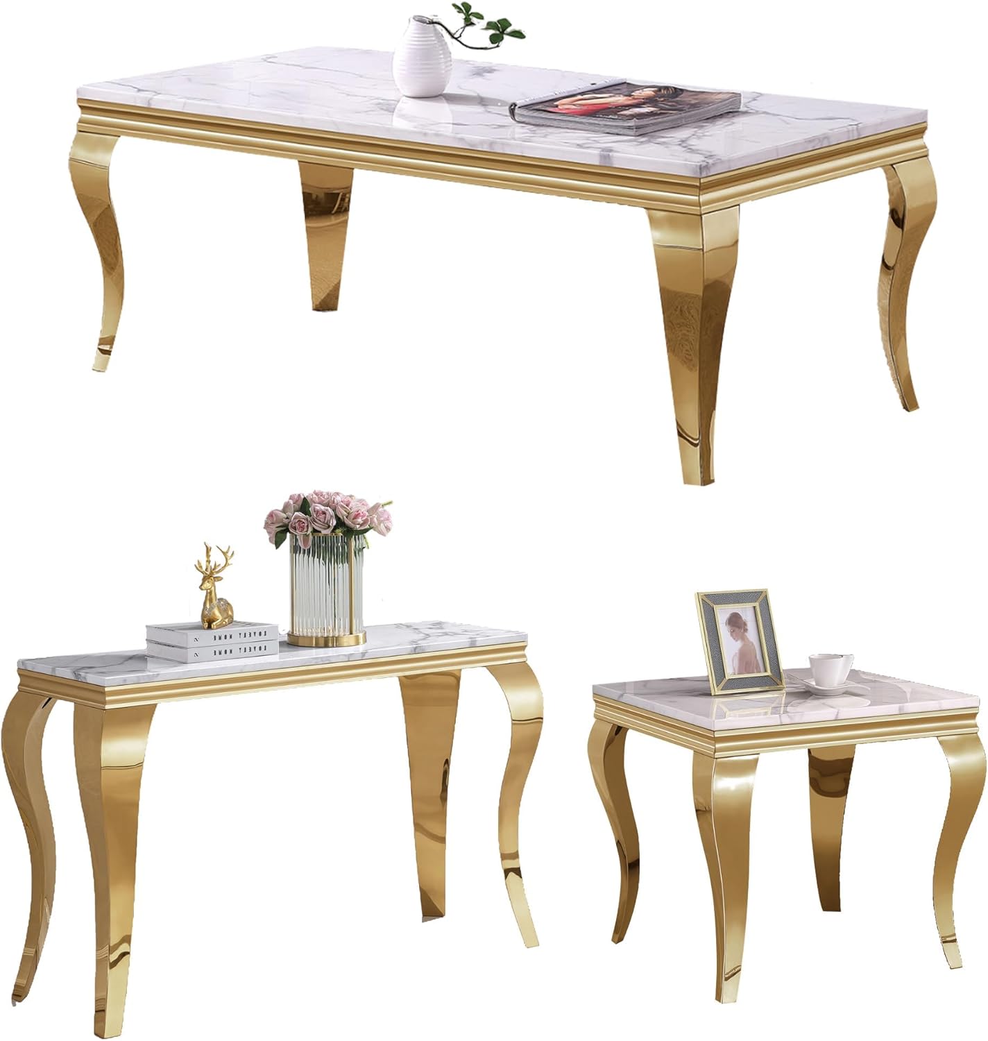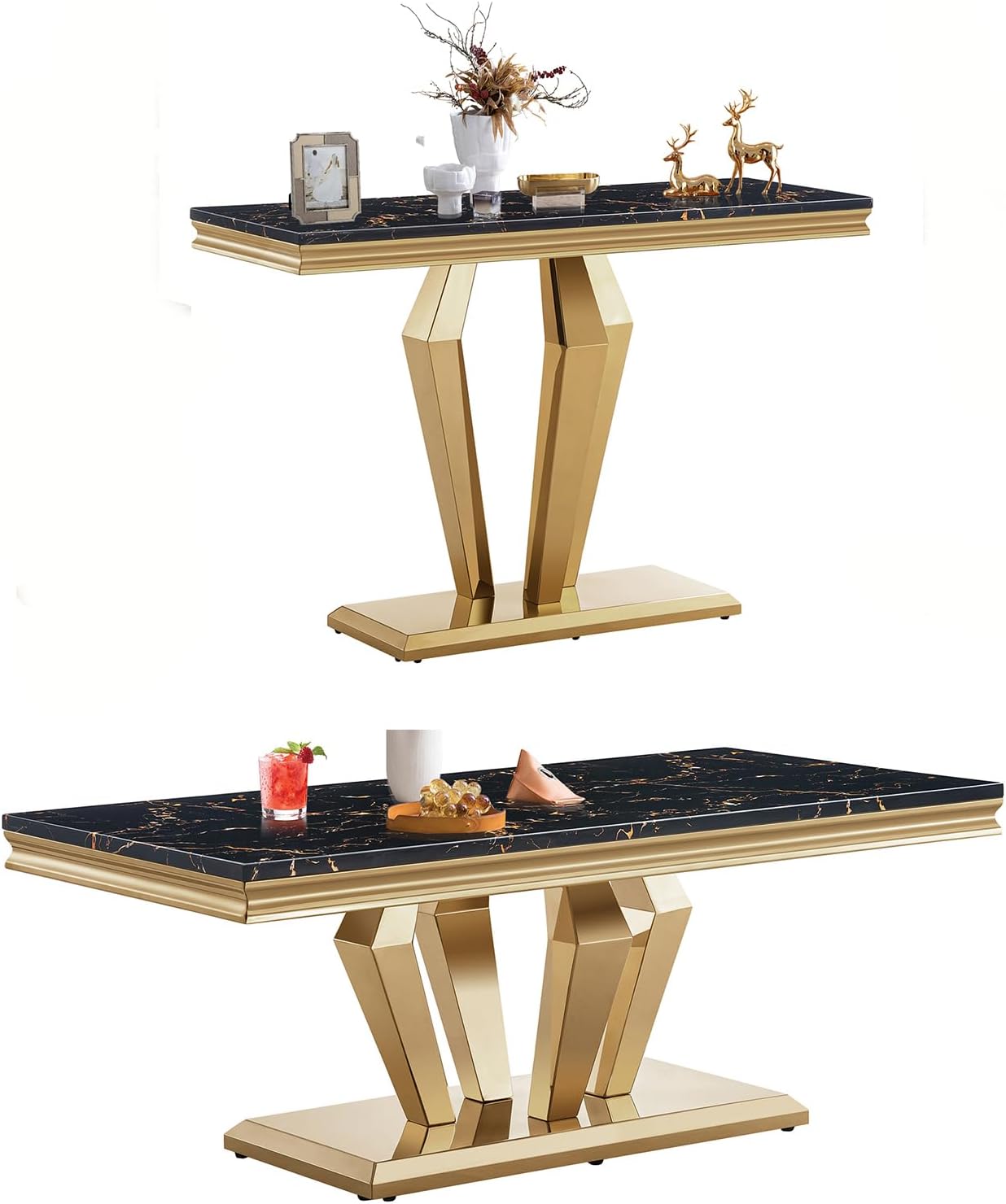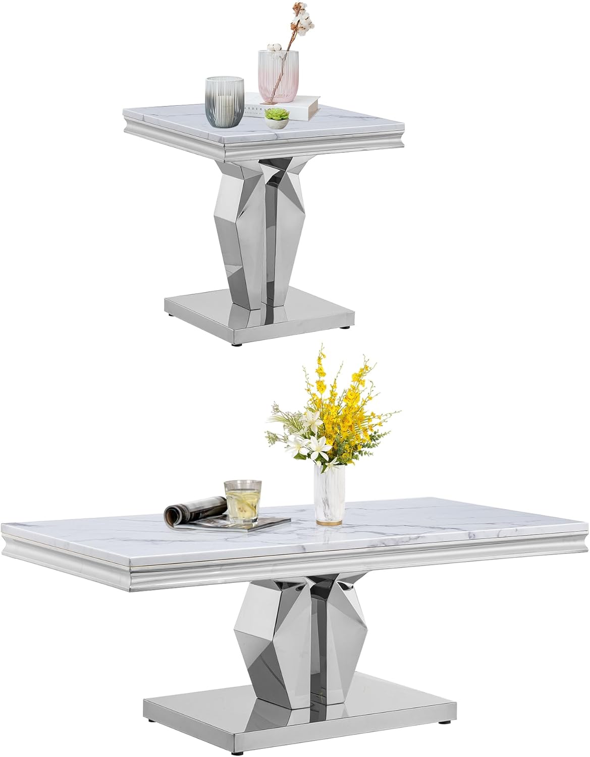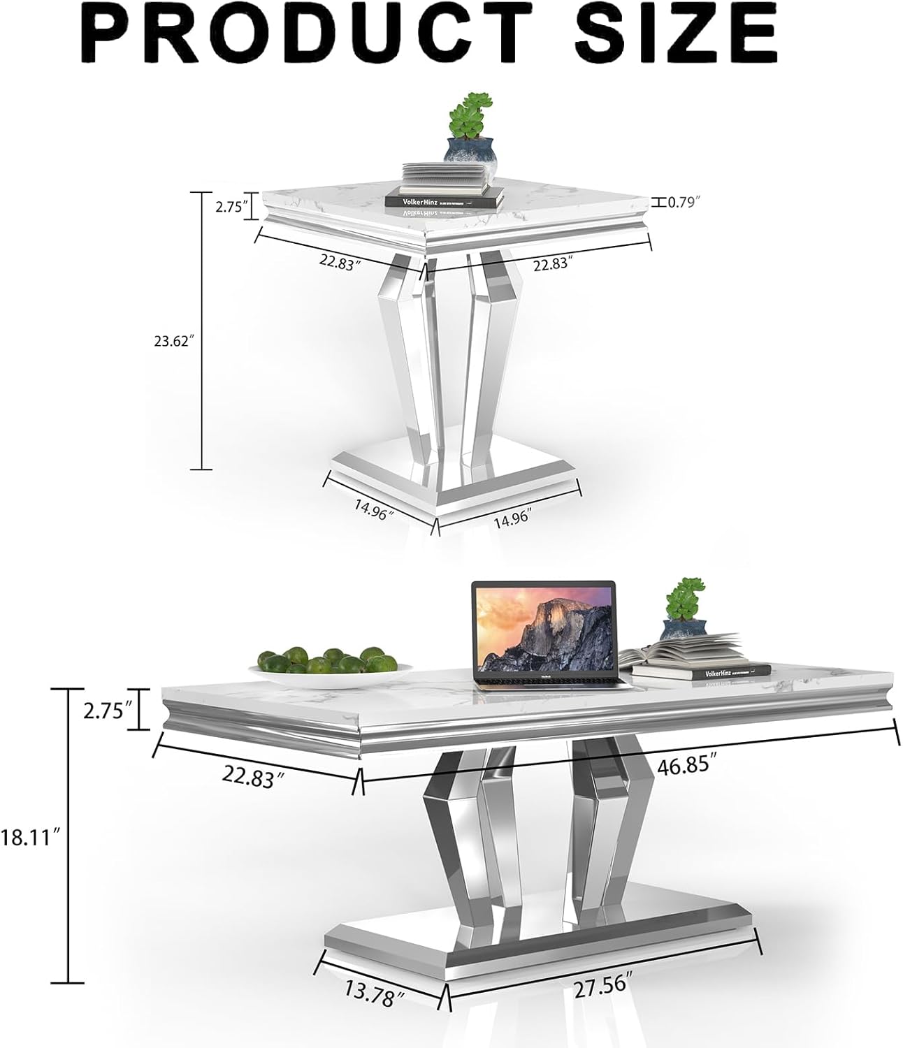 This 2-piece living room table set include 1 coffee table and 1 end table.It features ample and large storage space, enabling you to store your different stuff separately without taking up extra space. Simple and chic style, can be well integrated into a variety of room decoration. Faux Marble Coffee Table. Material: Faux Marble+Stainless Steel. Dimensions:46.85''L X 22.83''D X 17.72''H. Weight (lbs.): 66.14 Faux Marble End Table. Material: Faux Marble+Stainless Steel. Dimensions:22.83''L X 22.83''D X 22.83''H. Weight (lbs.): 46.14 Package:1 x Coffee Table,1 x End Table