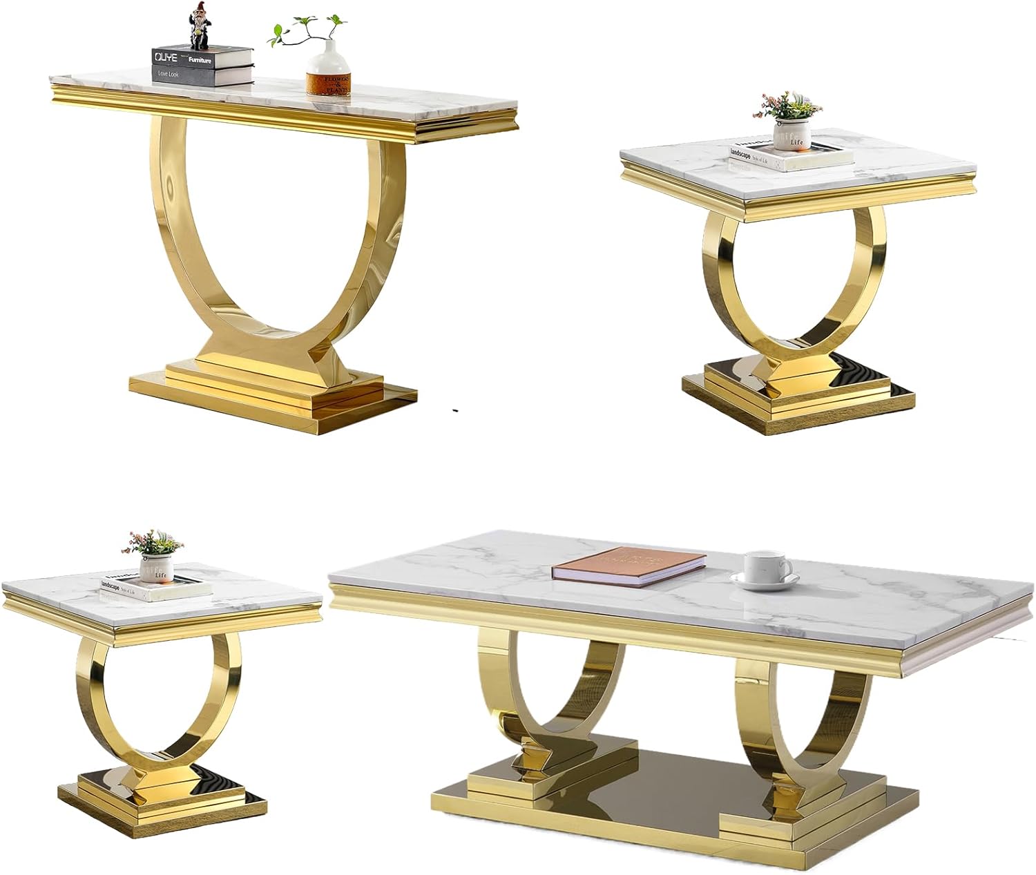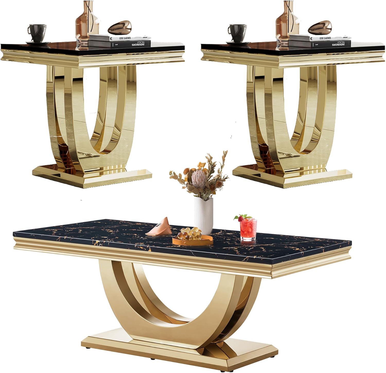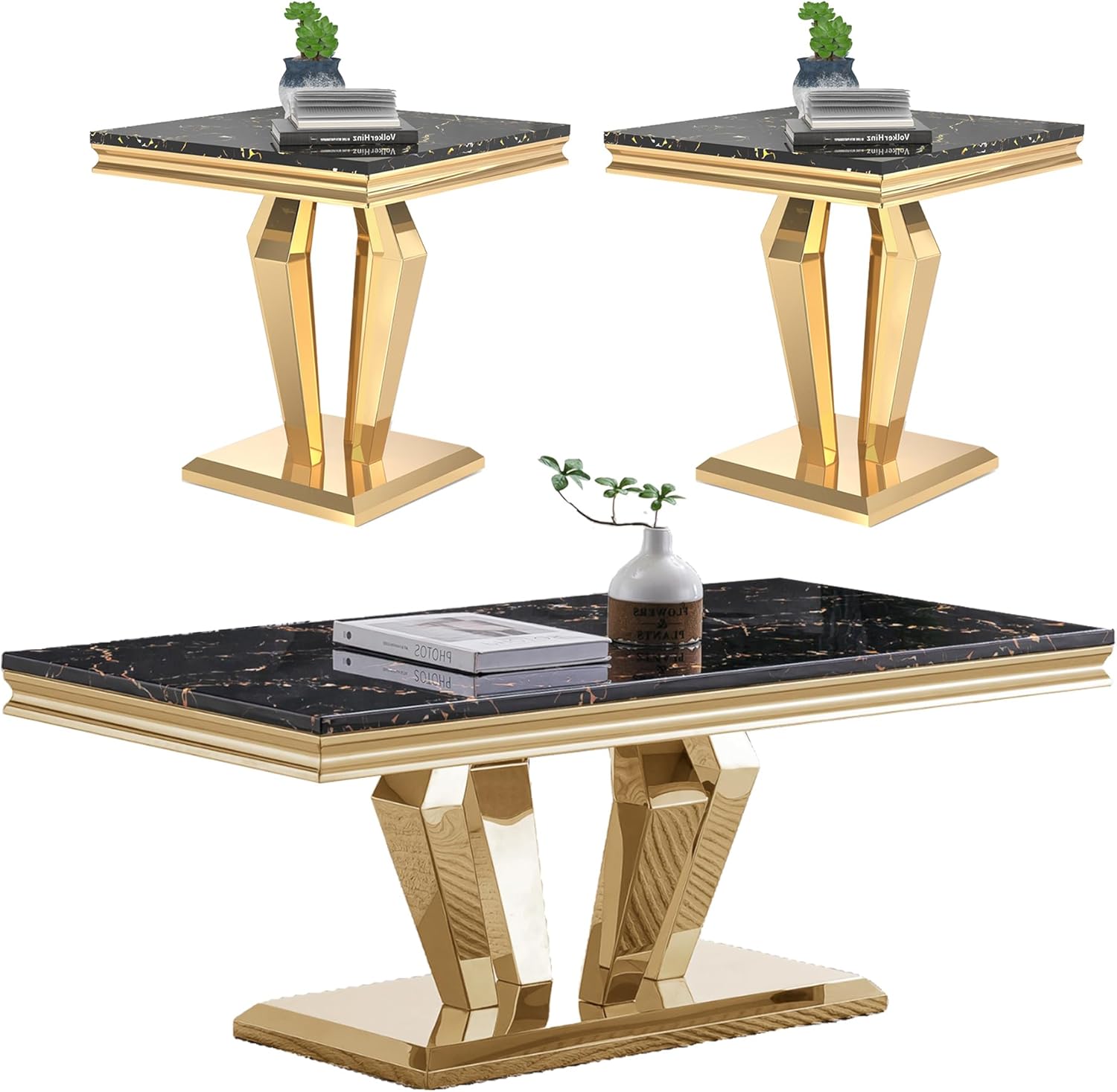 This 2-piece living room table set include 1 coffee table and 1 end table.It features ample and large storage space, enabling you to store your different stuff separately without taking up extra space. Simple and chic style, can be well integrated into a variety of room decoration. Faux Marble Coffee Table. Material: Faux Marble+Stainless Steel. Dimensions:46.85''L X 22.83''D X 17.72''H. Weight (lbs.): 66.14 Faux Marble End Table. Material: Faux Marble+Stainless Steel. Dimensions:22.83''L X 22.83''D X 22.83''H. Weight (lbs.): 46.14 Package:1 x Coffee Table,1 x End Table