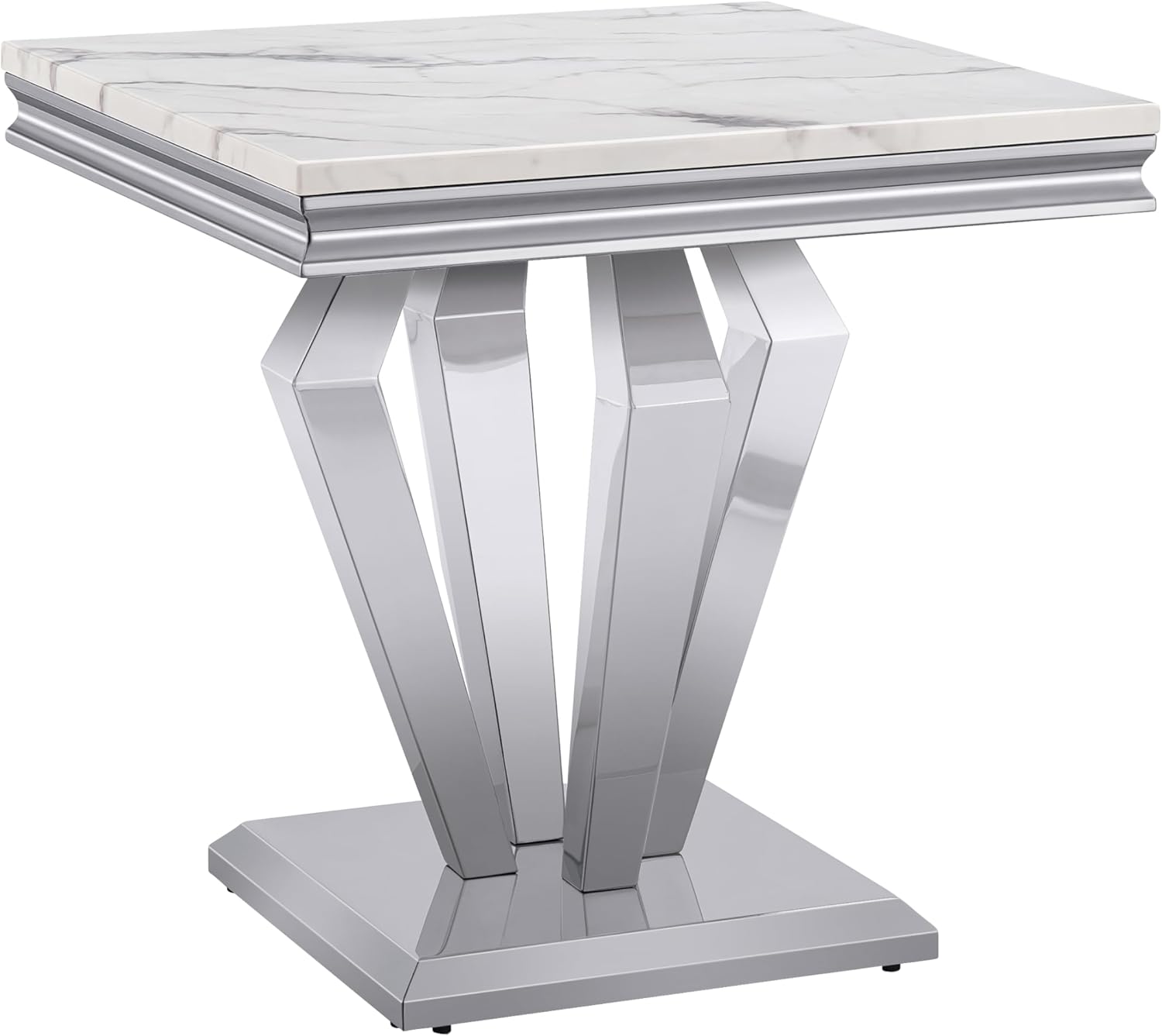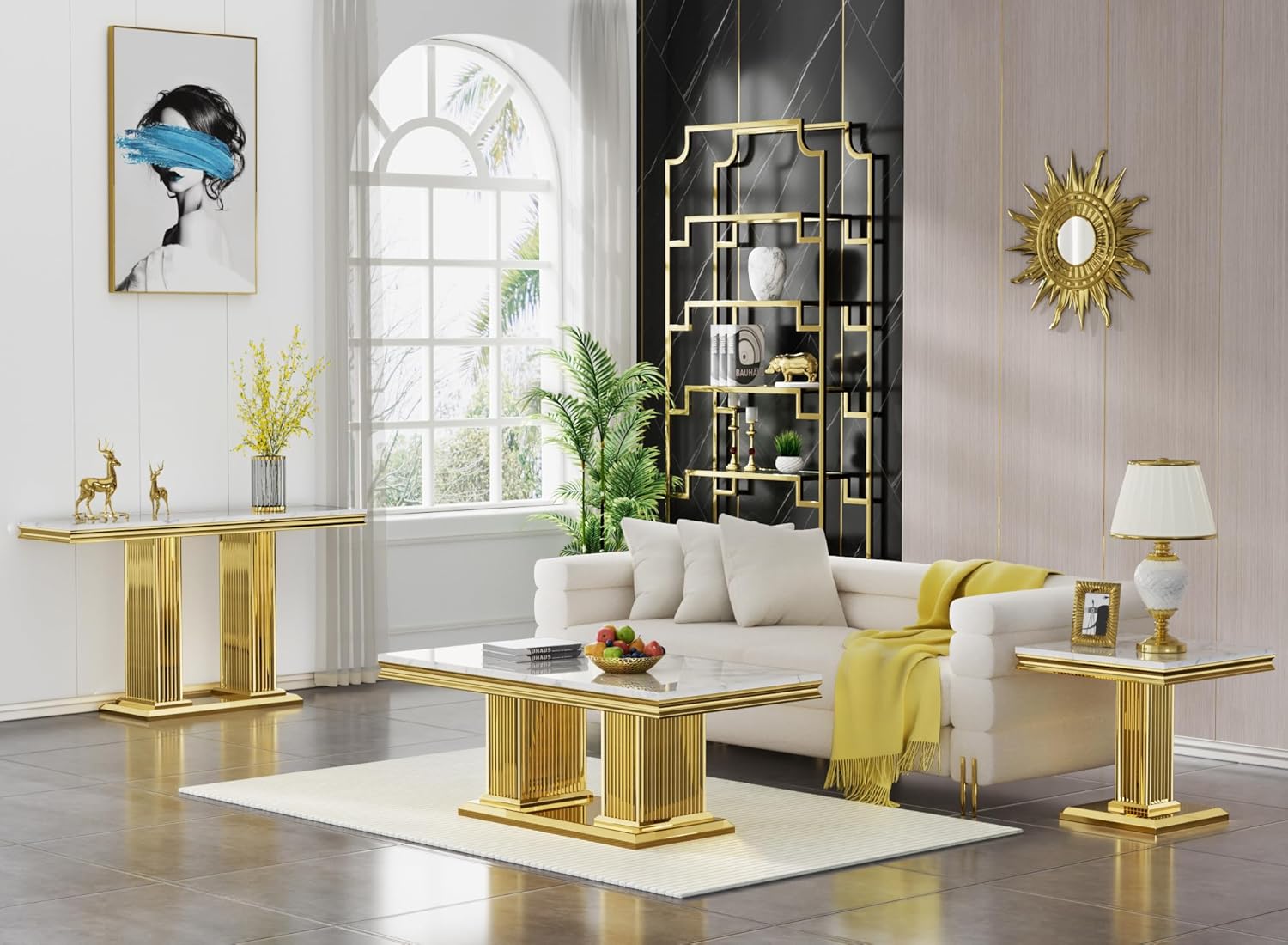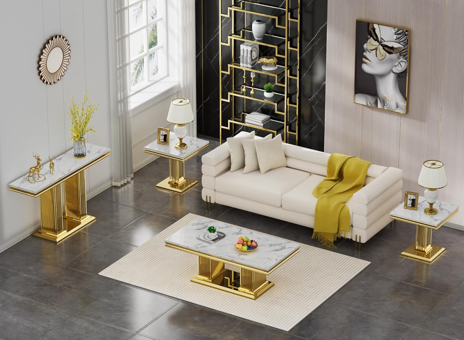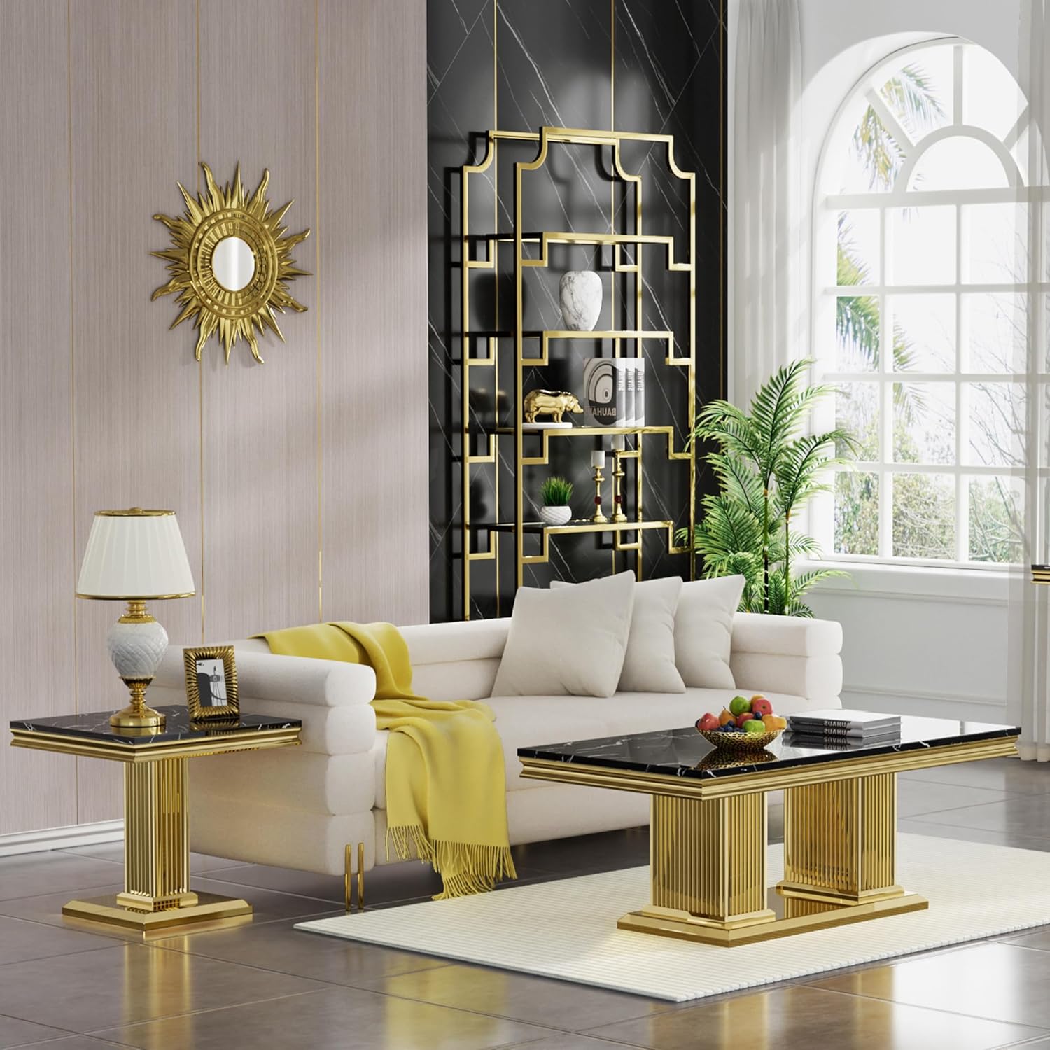 This 2-piece living room table set include 1 coffee table and 1 end table.It features ample and large storage space, enabling you to store your different stuff separately without taking up extra space. Simple and chic style, can be well integrated into a variety of room decoration. Faux Marble Coffee Table. Material: Faux Marble+Stainless Steel. Dimensions:46.85''L X 22.83''D X 17.72''H. Weight (lbs.): 66.14 Faux Marble End Table. Material: Faux Marble+Stainless Steel. Dimensions:22.83''L X 22.83''D X 22.83''H. Weight (lbs.): 46.14 Package:1 x Coffee Table,1 x End Table