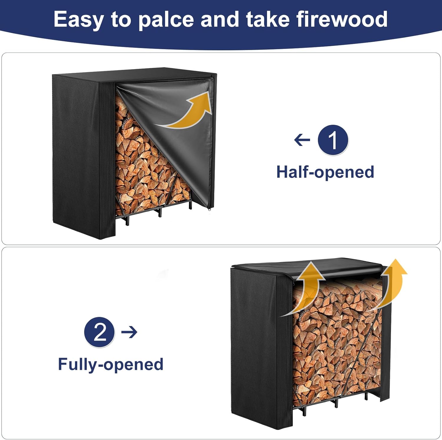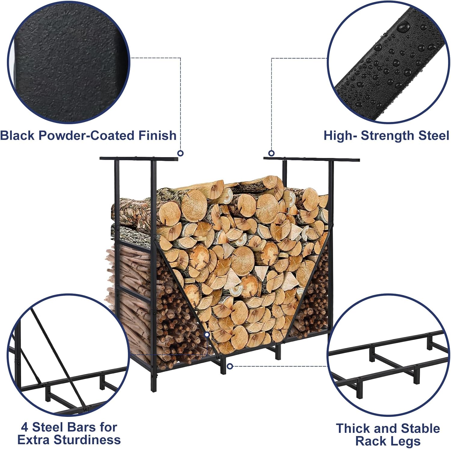 The firewood rack is designed to keep the firewood off the ground and facilitating easy stacking; Downward air vents provide dry ventilation, reduce potential condensation and moisture and wind lofting, keeping wood dry for use
