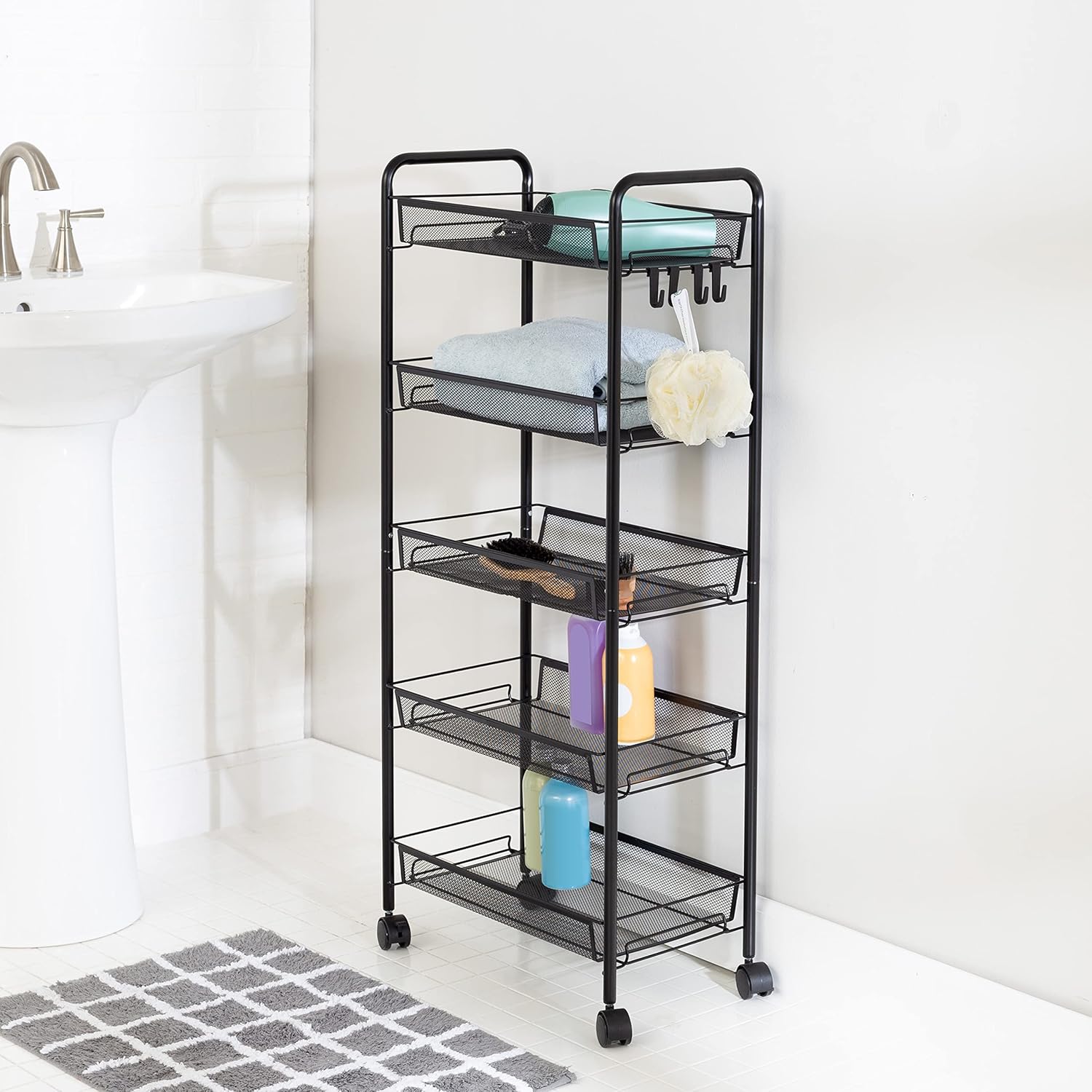 This rolling storage cart is a versatile metal organizer that is up to any task. Its 5 mesh shelves provide ample room for all of your storage needs, while the 4 wheels allow you to roll it around with ease. And there is no need to worry about your items taking a dive while this rolling shelf cart is on the move—the wheels provide a smooth ride, while the tray-shaped shelves keep all your items corralled. Need to keep items easily accessible? The 4 side hooks are a simple yet powerful addition that will hold everything from cooking utensils to hair accessories within reach.