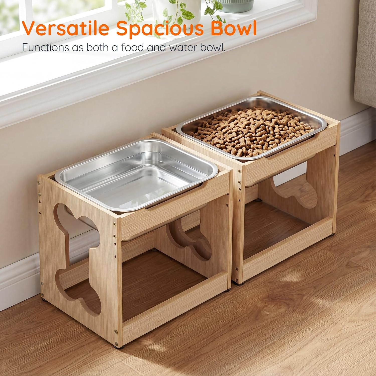 • Natural Wood Look and Simple Cleaning: Featuring a warm wood finish and playful bone-shaped cutouts, this dog feeding station blends easily with your home. The smooth surfaces and removable stainless steel bowl allow for quick wipe-downs, supporting a tidy feeding area